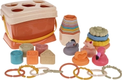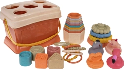 Комплектът съдържа форми, подходящи за строене и сортиране, което помага за развитието на фината моторика. Децата могат да опитат да подреждат куличка или да създават различни конструкции. Всички части могат лесно да се приберат в практична кутия след игра, което учи децата да поддържат ред.