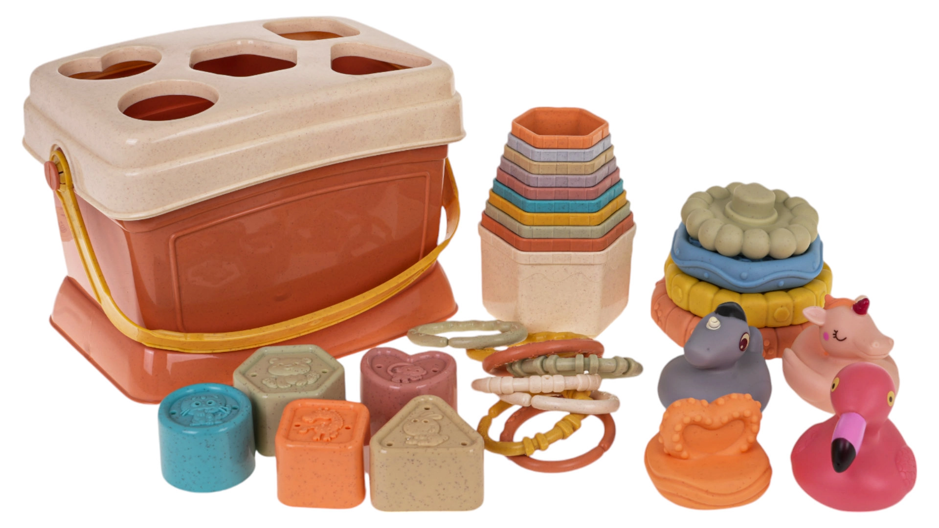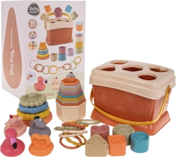 Детският комплект с форми и сортер е отличен образователен комплект за деца от 6-месечна възраст. Развива детското въображение и ги учи да разпознават цветове и форми. Всеки елемент от този комплект е проектиран така, че с ярките си цветове и интересни форми да привлича вниманието на децата и да ги насърчава към игра.