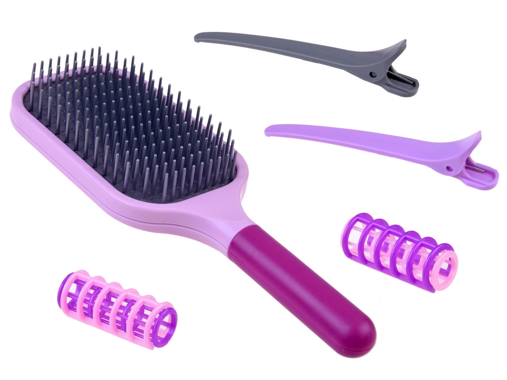 Разделете кичурите със щипките, разресвайте косата с четката и оформете с ролките – лесни и безопасни инструменти за малки ръчички.