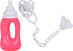Включени са розово шишенце и бяла залъгалка с верижка и клипс – аксесоари, които подпомагат реалистичната грижа.