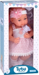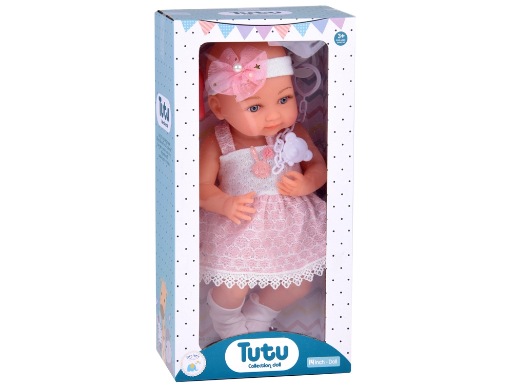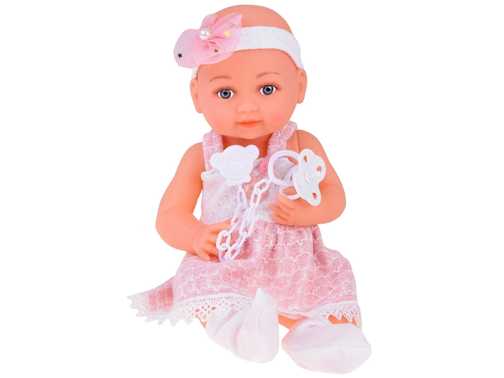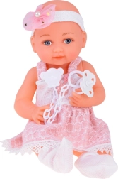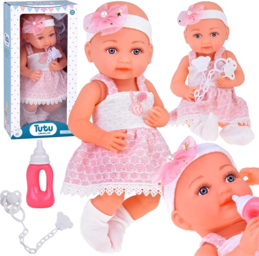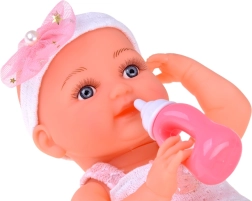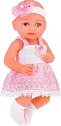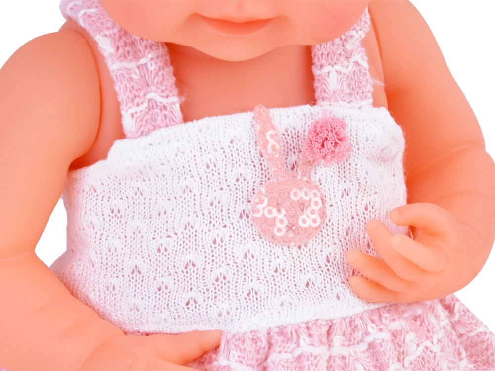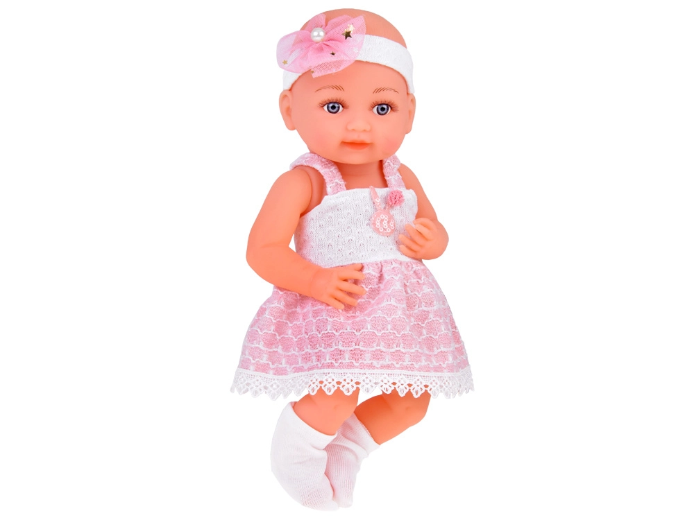 Тази прецизно изработена кукла от издръжлива пластмаса и текстил впечатлява с детайлно личице, нежен израз и красив тоалет в розово и бяло. Бебето е украсено с лента за глава с панделка и перличка, а на крачетата има бели чорапки. Очите не се затварят, но благодарение на изразителните мигли изглеждат много живи.
