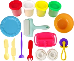 Комплектът включва четири кутийки пластилин в цветовете бял, червен, зелен и жълт, практичен валяк, ножче и шпатула за оформяне, купичка и чинийка. Консистенцията на масата наподобява истинско тесто, така че децата могат да експериментират без разхищение на храна, а родителите — без притеснения за бъркотия.