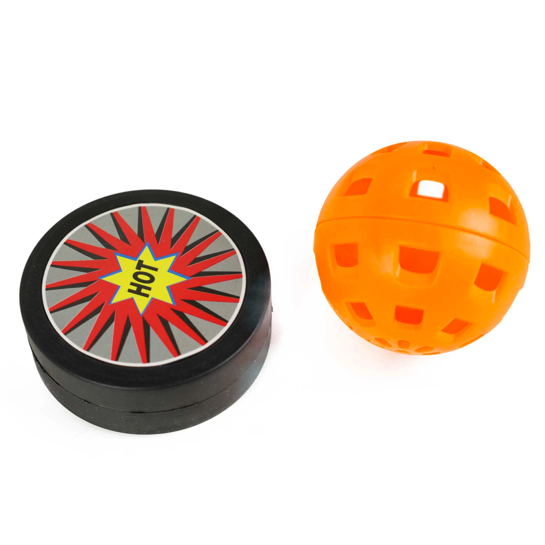 Опаковката съдържа всичко необходимо за бърза игра – топче, шайба и два стика.