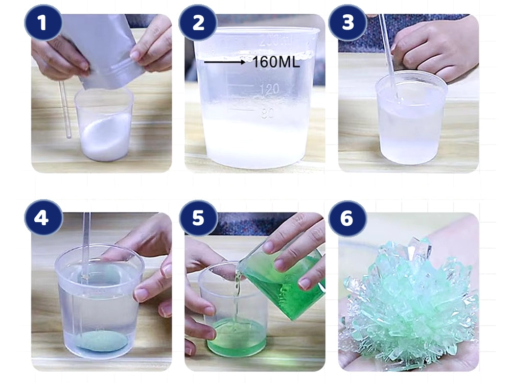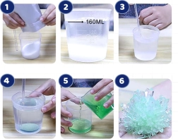 Достатъчно е да смесите кристален прах със 160 ml вряла вода, да оставите да изстине приблизително до 45 °C, да добавите „семена“ за кристал и след 4–7 дни да се радвате на оригинални, цветни кристали. Всичко необходимо е в опаковката, така че можете да започнете веднага.