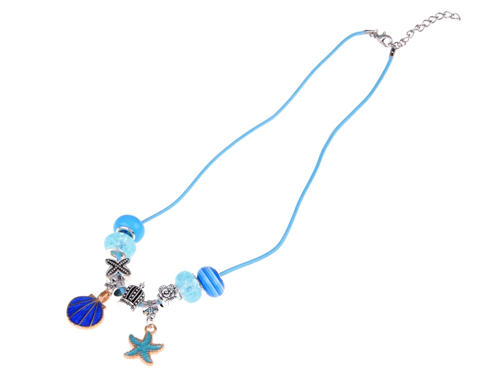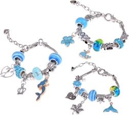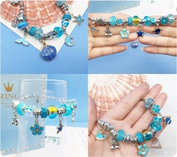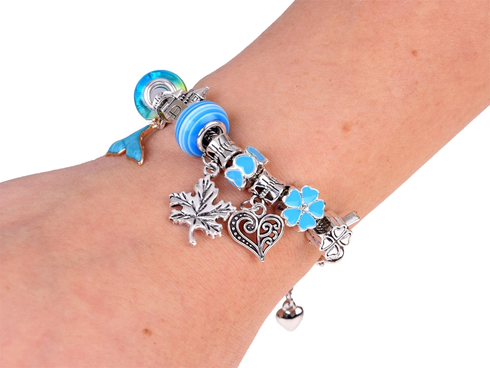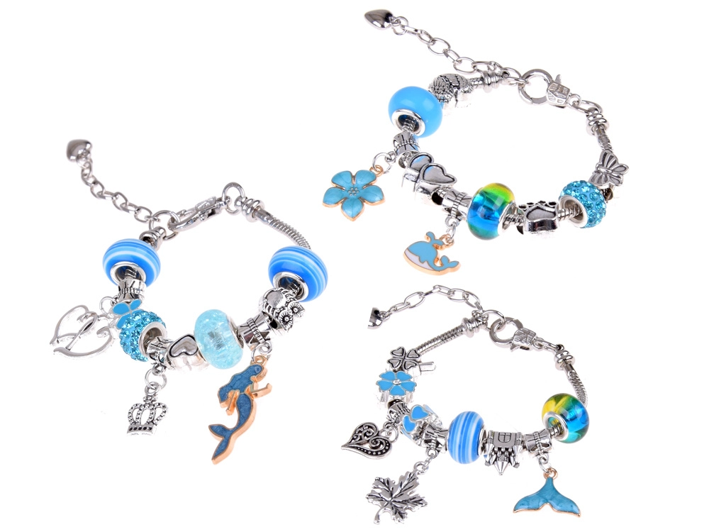 Сребърно‑сини мъниста, висулки и верижки с морски, цветни и сърцевидни мотиви – безкрайни възможности за комбиниране.