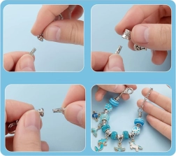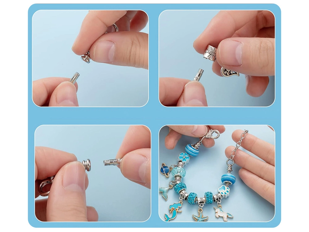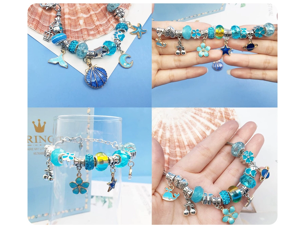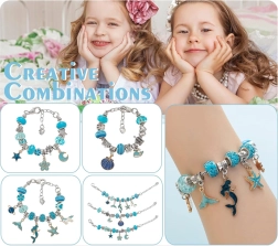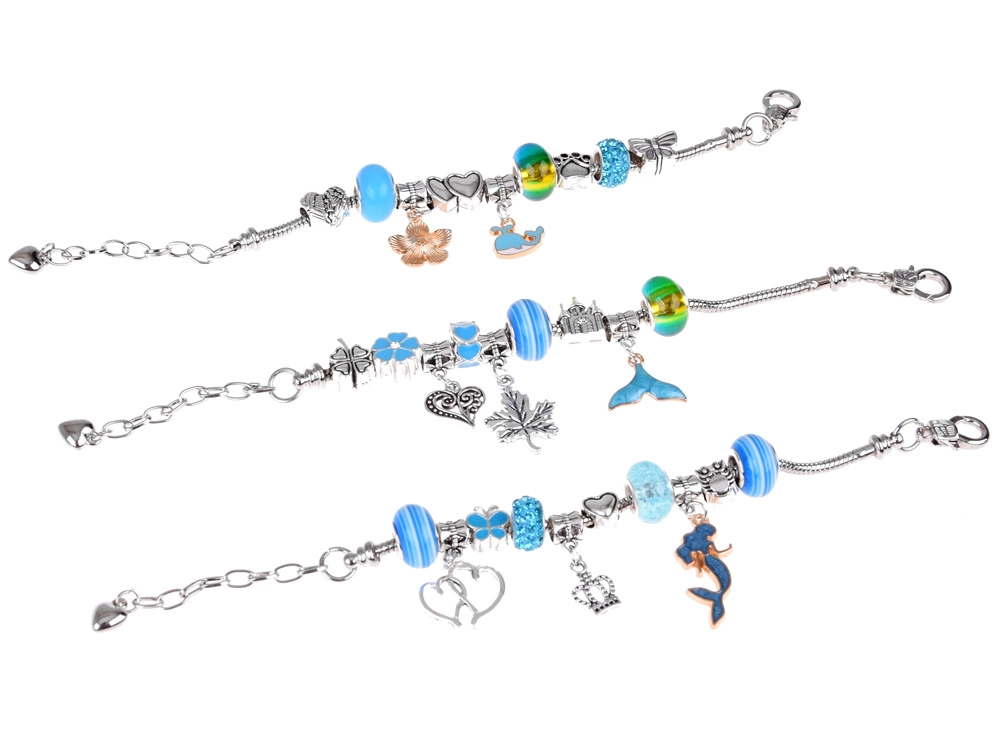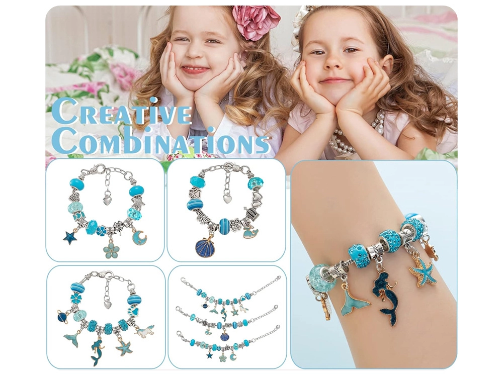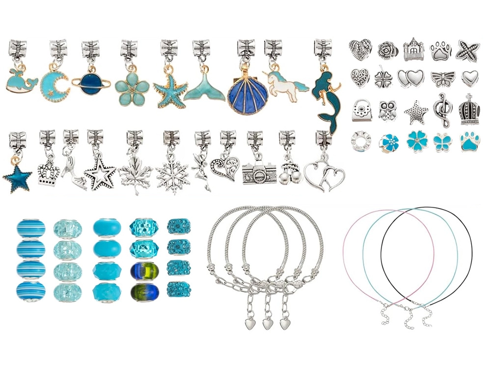 Този креативен комплект предлага богат избор от компоненти за лесно нанизване и сглобяване на собствени аксесоари. Метални гривни, регулируеми верижки и восъчни връзки, допълнени с декоративни мъниста и чарм висулки, позволяват да създадете бижута точно според вашето въображение – от морски мотиви до сърчица и цветя.