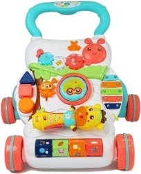 Тази многофункционална образователна проходилка е идеална за деца, които пълзят или се учат да ходят. Стабилната, масивна изработка от безопасни материали и ергономичната дръжка със свирка дават увереност при всяка стъпка. При движение колелата светват, което мотивира към нови опити за ходене и стимулира зрителното възприятие.
