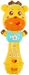 При дълго натискане записвате собствения си глас; микрофонът свети, възпроизвежда 30 мелодии и учи числа и думи. Има бутон за регулиране на силата на звука.