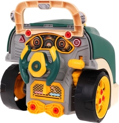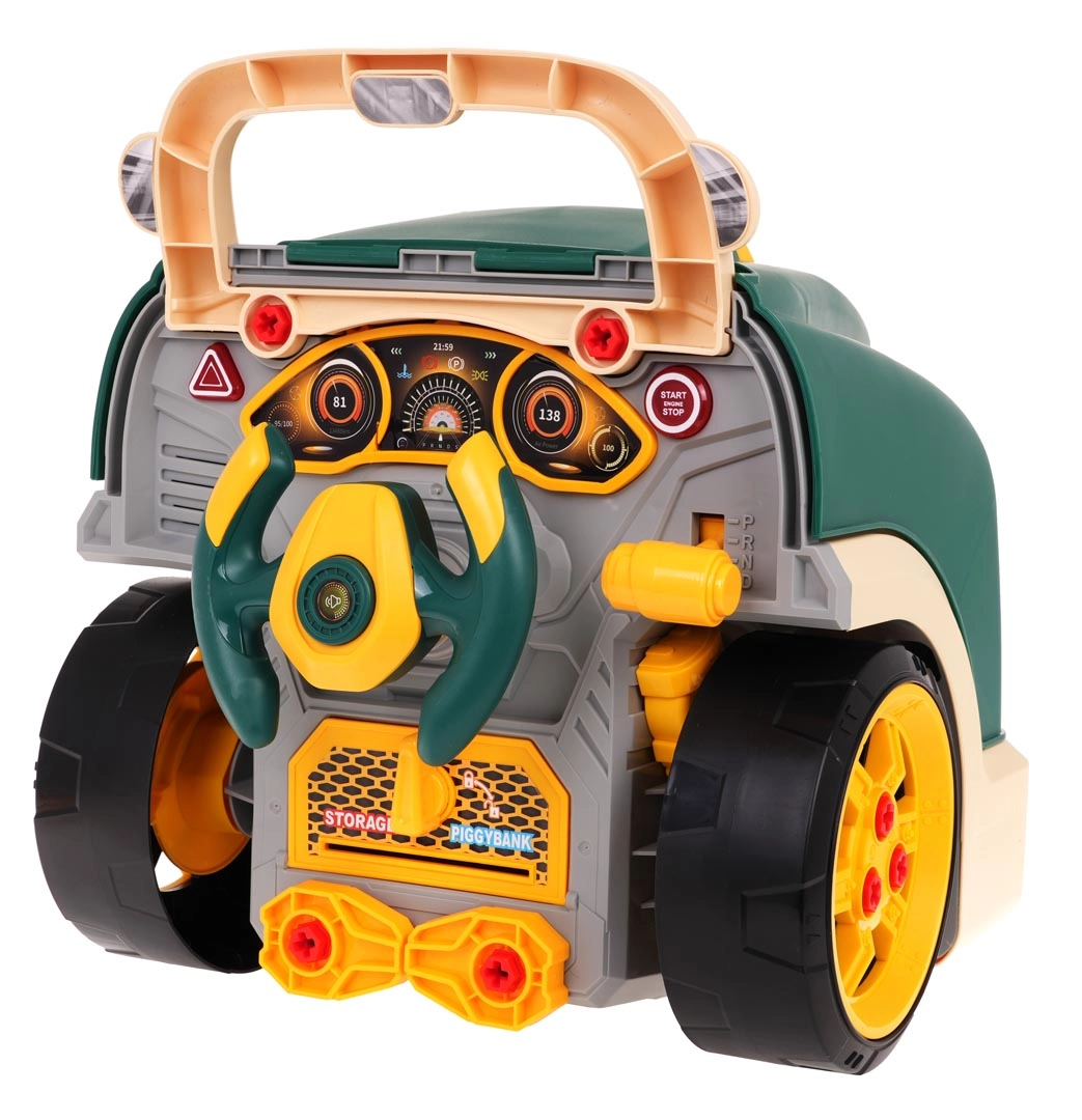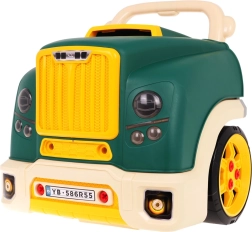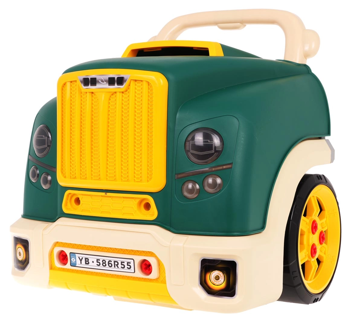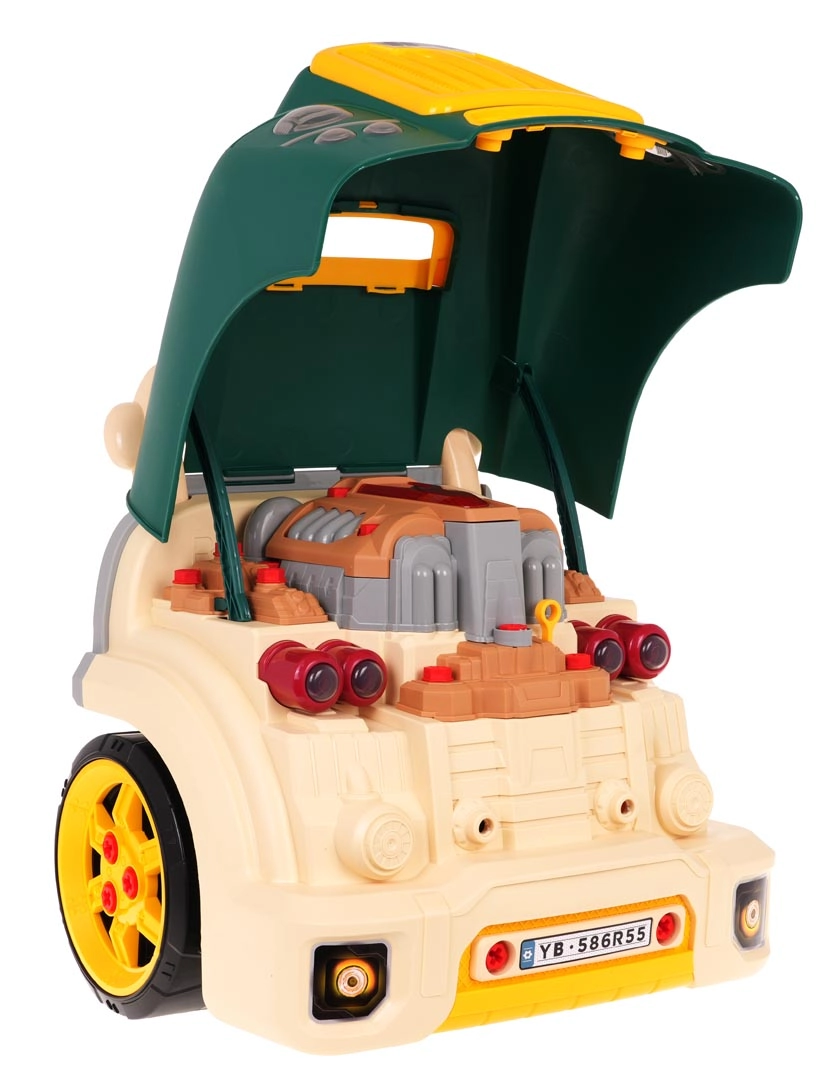 Тази зелена предна част на товарен автомобил с повдигащ се капак предлага богато интерактивно забавление: разглобяем двигател, светещи фарове и автентични звуци на запалване, движение и заден ход. На таблото ще откриете старт бутон, волан с клаксон, предупредителен сигнал и скоростен лост. Под волана има практично отделение за инструменти и винтове, както и удобна дръжка за лесно пренасяне.
