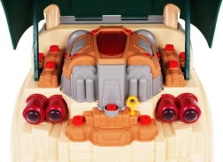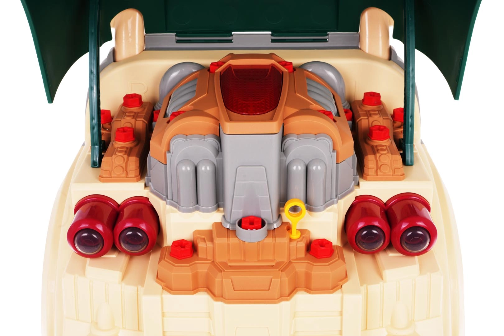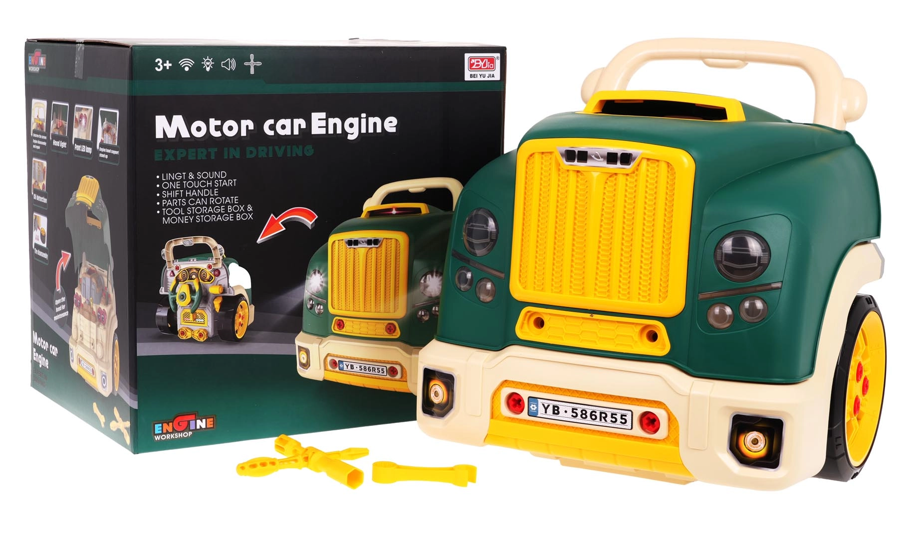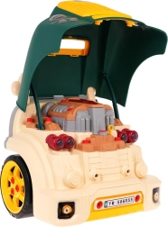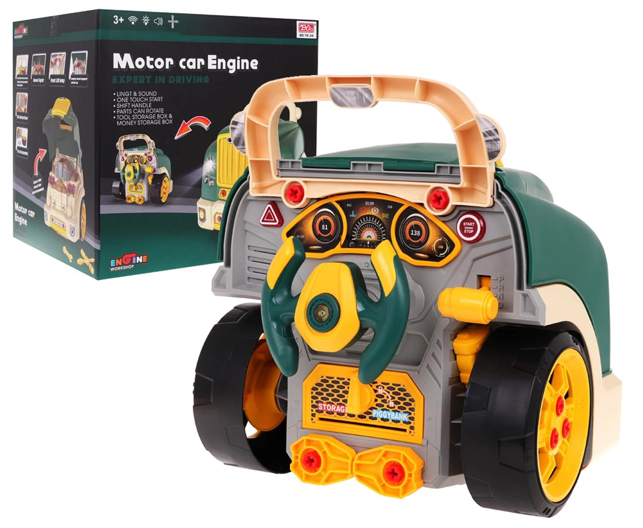 Тази зелена предна част на товарен автомобил с повдигащ се капак предлага богато интерактивно забавление: разглобяем двигател, светещи фарове и автентични звуци на запалване, движение и заден ход. На таблото ще откриете старт бутон, волан с клаксон, предупредителен сигнал и скоростен лост. Под волана има практично отделение за инструменти и винтове, както и удобна дръжка за лесно пренасяне.