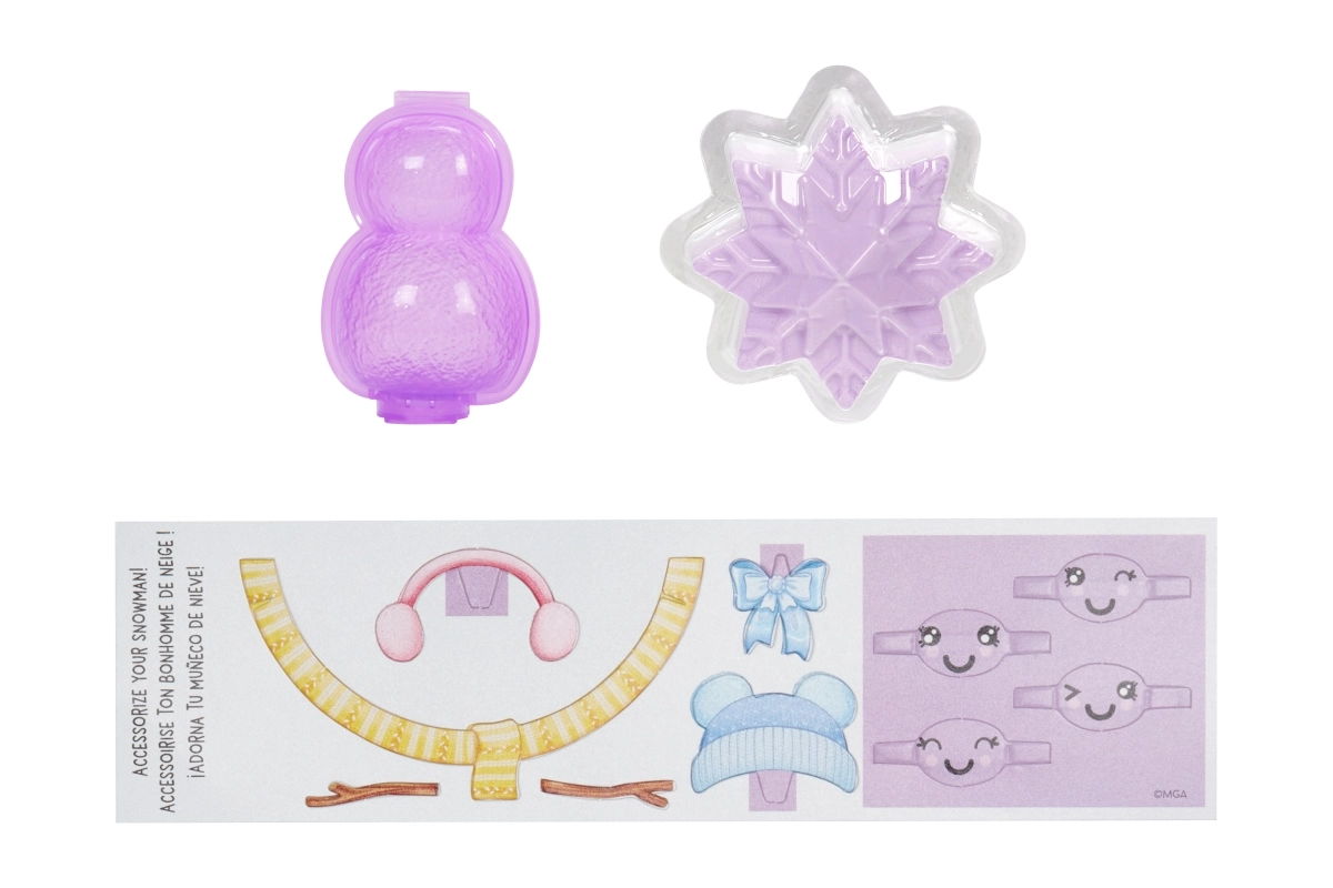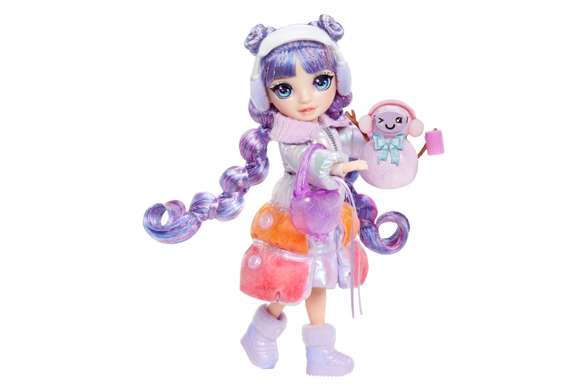 В опаковката ще намериш също зимни аксесоари за стилизиране и снимки, практична стойка за изложение, четка за коса и креативен комплект за създаване на собствен снежен човек от оформяем „сняг“. Напълно артикулираната кукла лесно позира и с лилавия си стил озарява всяка колекция.