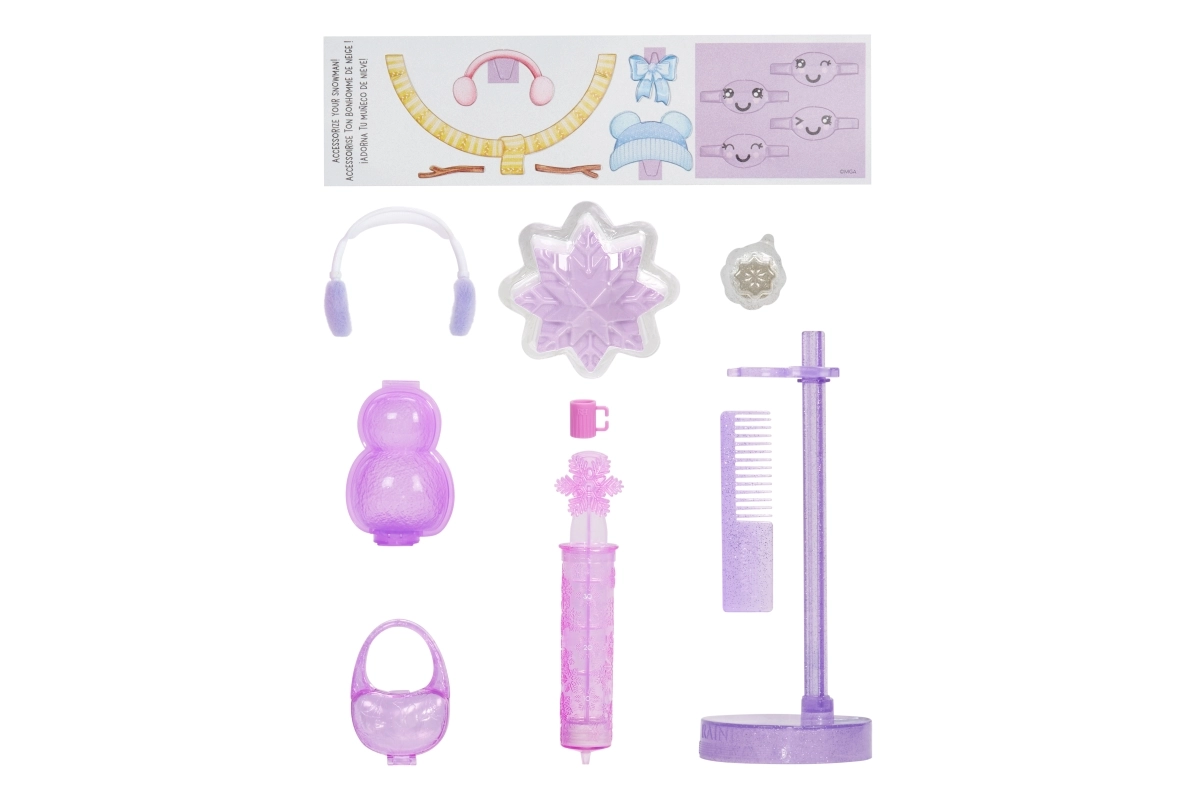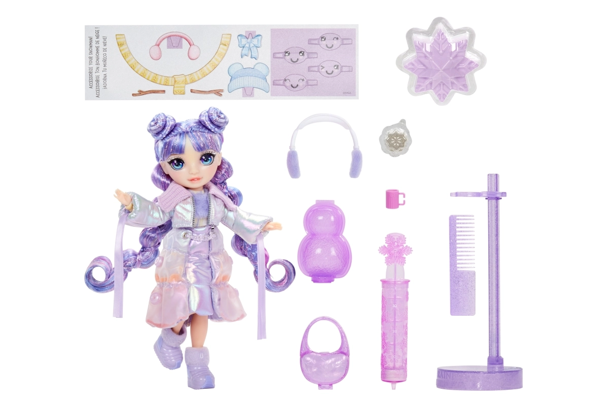 Включени са стойка, четка за коса и зимни аксесоари като наушници, слушалки и чанта. Всичко за перфектно съчетан лилав външен вид и креативна игра.