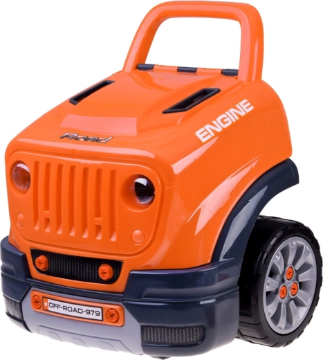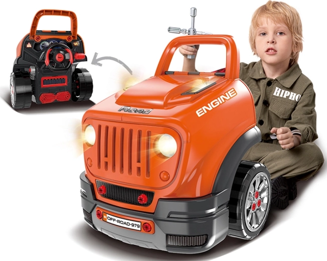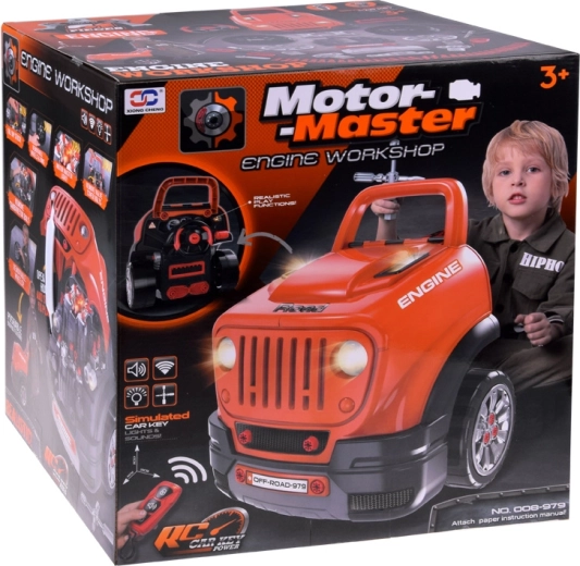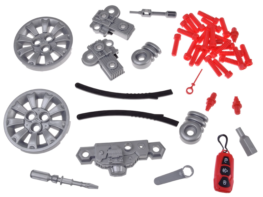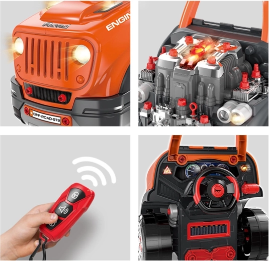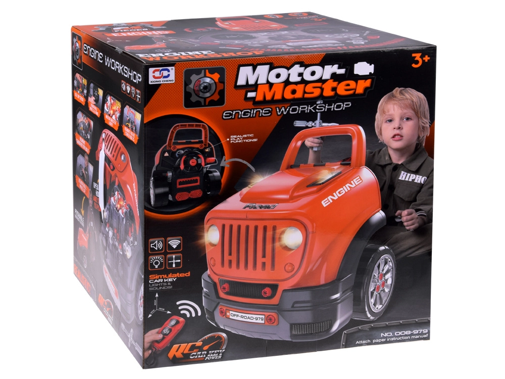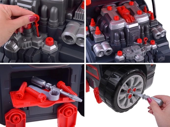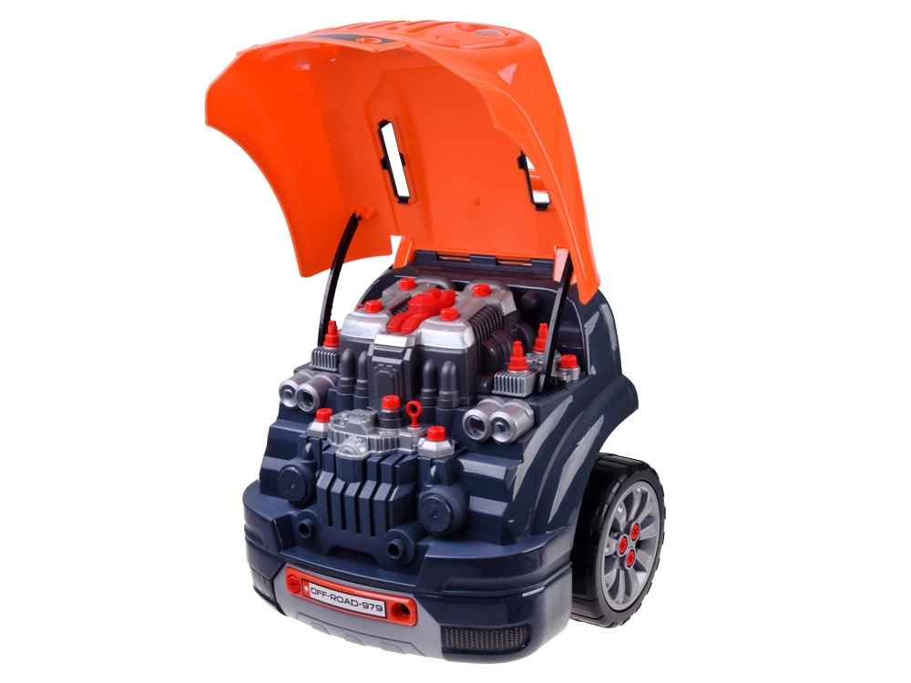 Интерактивният сервизен комплект за малки механици реалистично симулира работа в автосервиз. Децата могат да отварят капака, да разглобяват и сглобяват отново подвижния мотор, да сменят колела и тасове, да пробват стартиране с бутон и да използват звукови и светлинни ефекти – от клаксон и задна предавка до аларма и аварийни светлини.