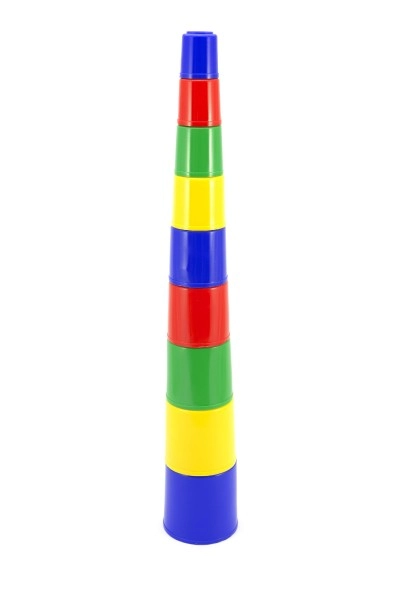 Всяка чашка има различен цвят и размер. При строене на кула или вместване една в друга децата се учат да различават цветовете, да подреждат по размер и да разбират последователността.