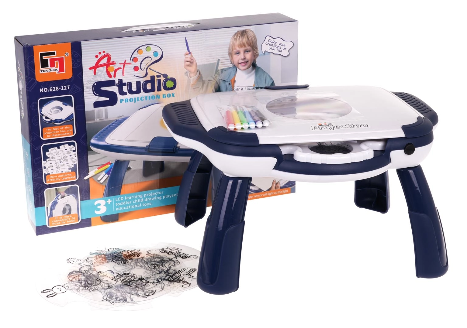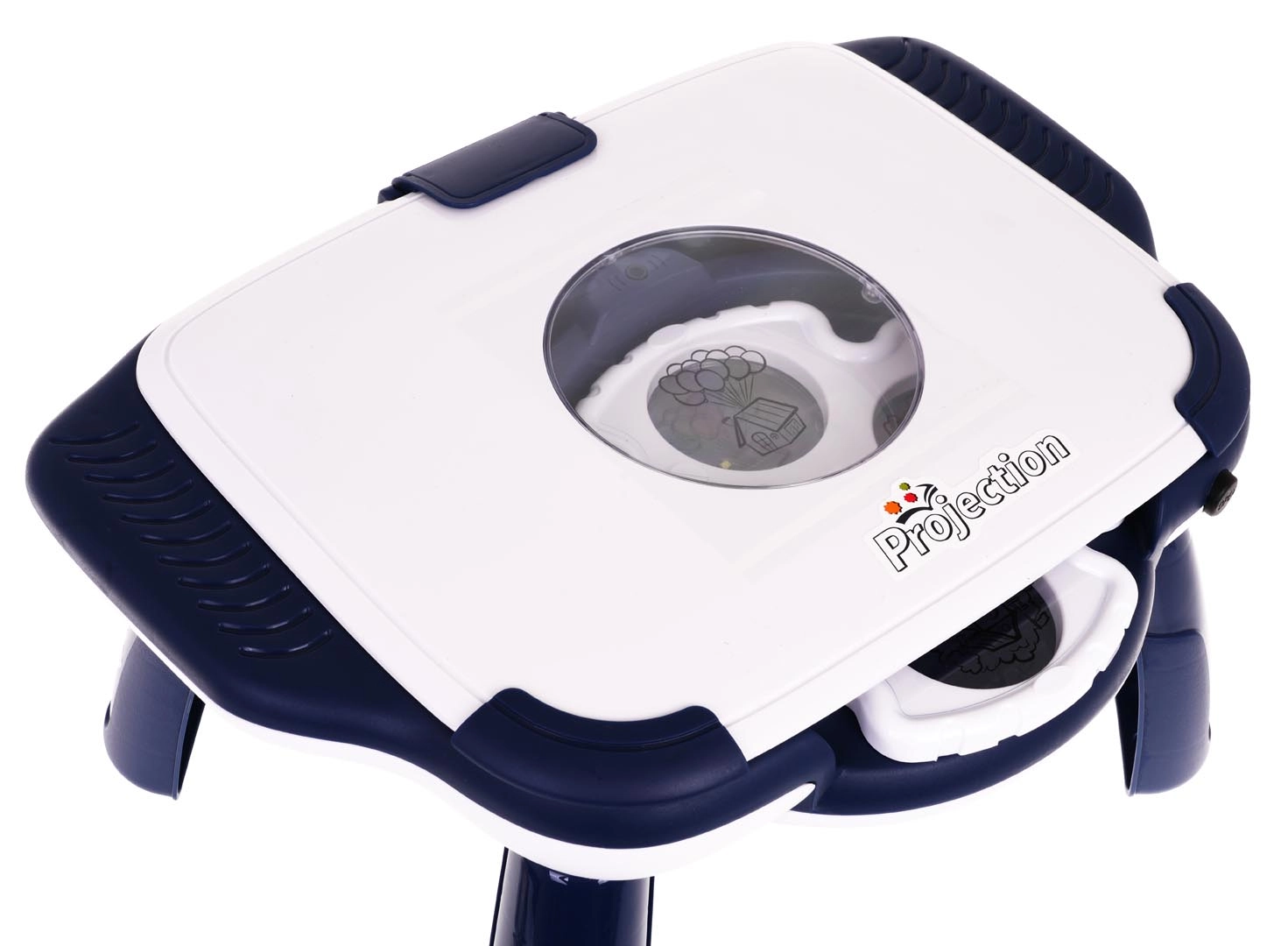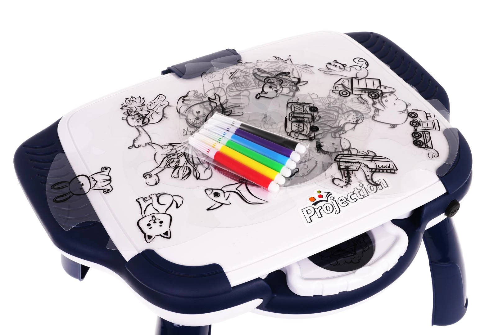 Прожекционната масичка за рисуване е чудесен начин да улесните първите стъпки на децата в света на създаването. Благодарение на 12-те диска с по 4 слайда на всеки, те могат да избират от десетки изображения – от животни и динозаври до превозни средства, къщи и растения. Изображението се прожектира директно върху площта за рисуване и детето може лесно да го прерисува.