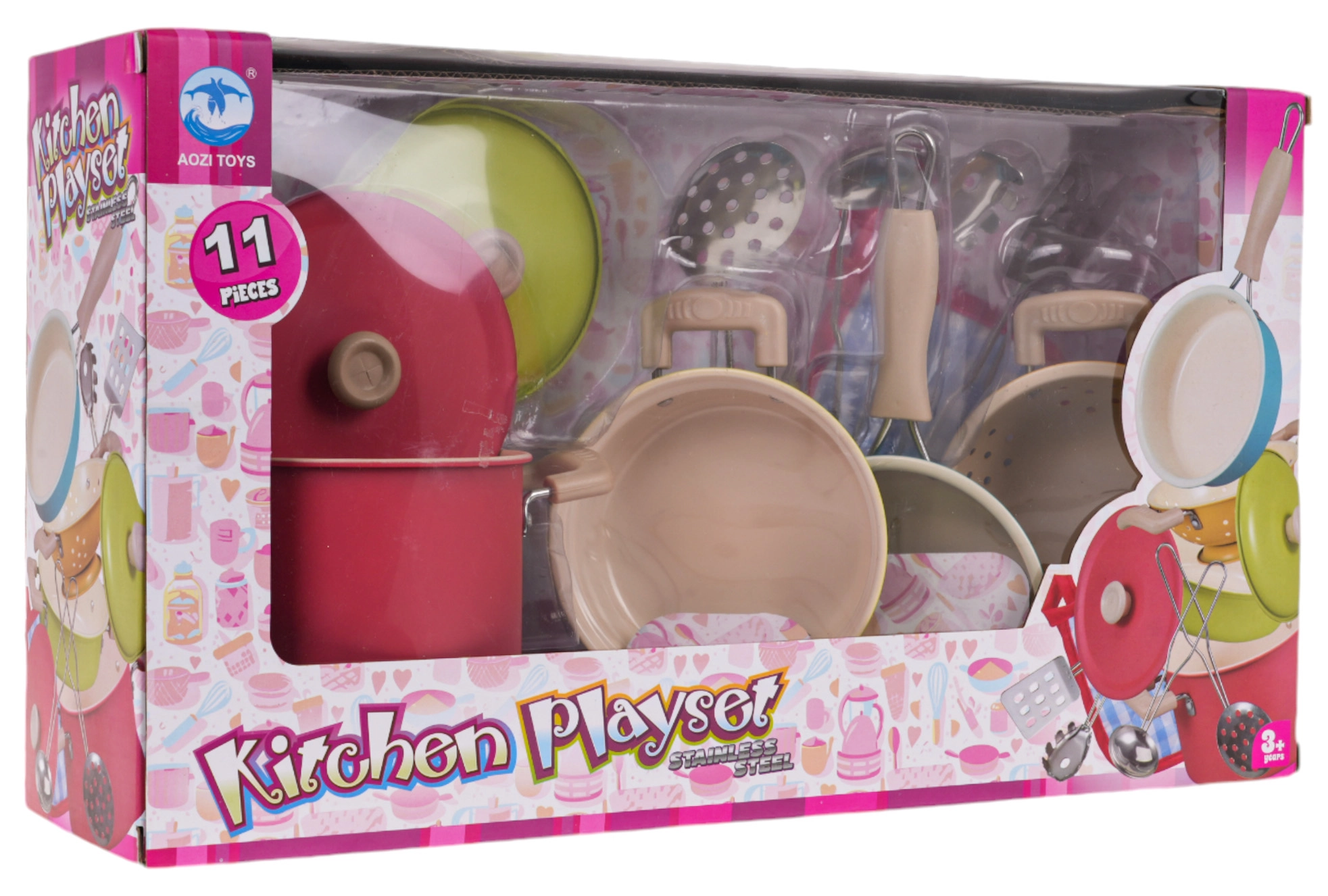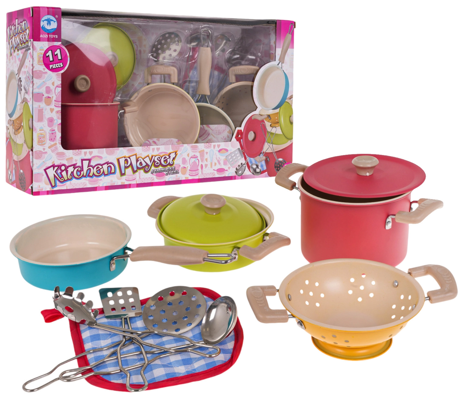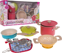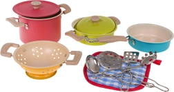 Развийте детското въображение с 11-частов комплект метални съдове и инструменти за малки готвачи от 3 години. Комплектът включва тенджери с капаци, тиган, цедка и прибори и впечатлява с ярки цветове, издръжлива метална изработка и богато съдържание за реалистична игра на готвене.
