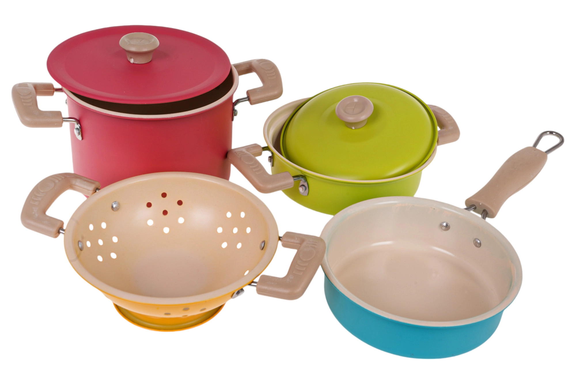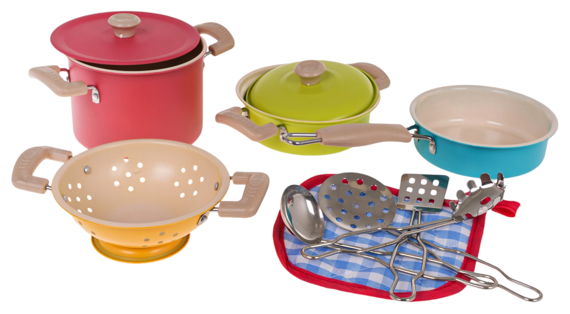 Този цветен детски комплект съдове носи автентично изживяване от готвенето във всяка детска кухничка. Две тенджери с капаци, тиган, цедка и четири практични кухненски инструмента осигуряват всичко необходимо на децата, за да имитират истинско готвене. Благодарение на металните материали комплектът е здрав, издръжлив и готов за ежедневна игра.