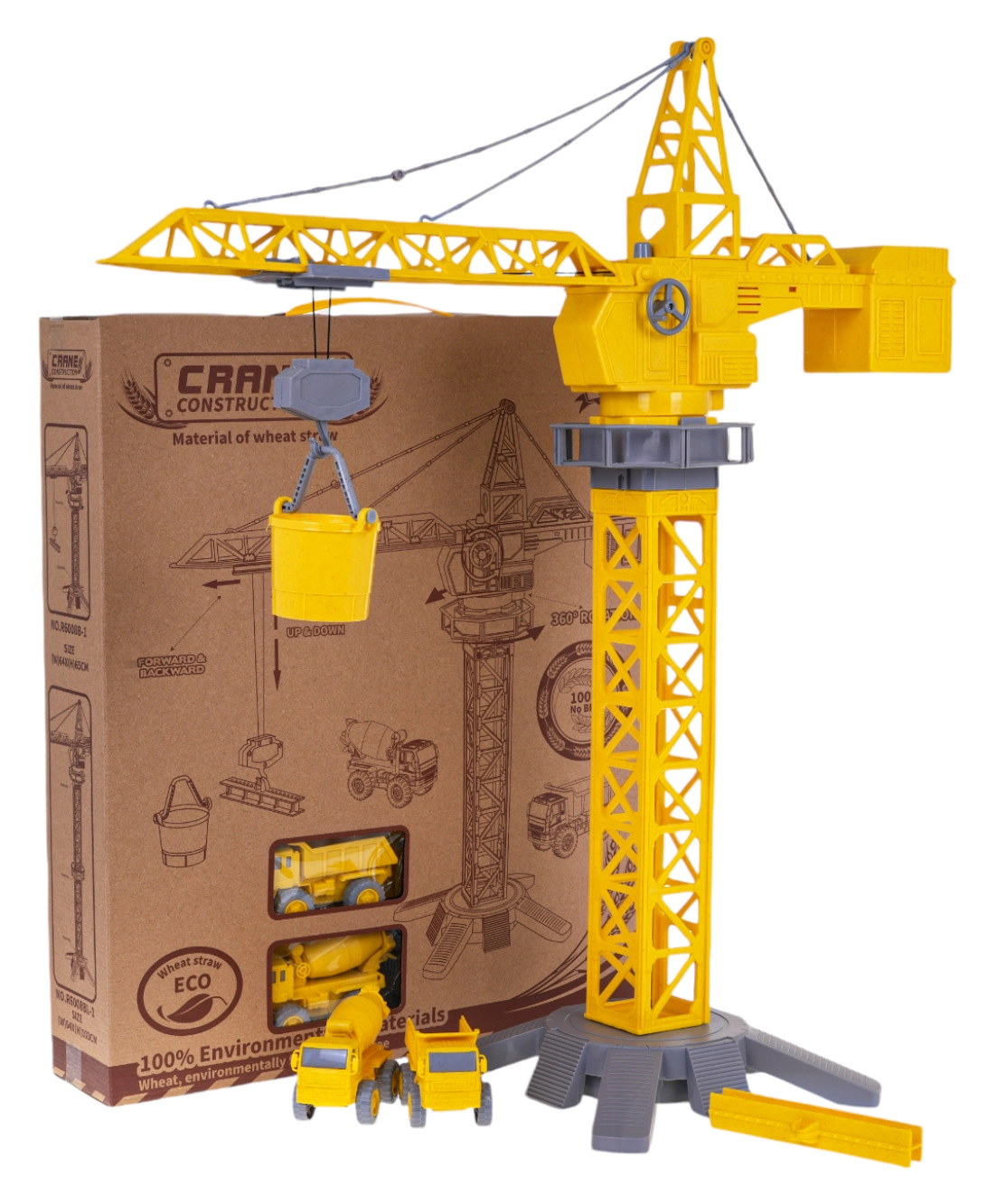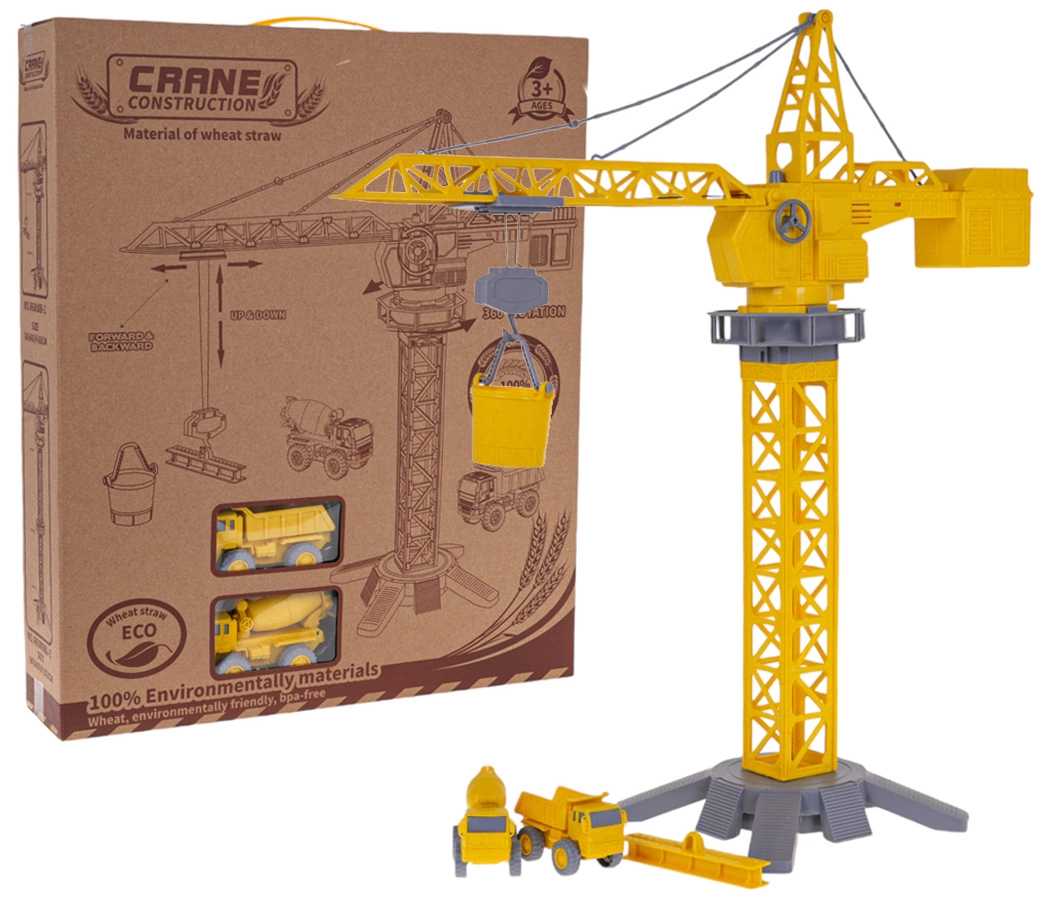 Еко строителен кран и превозни средства е идеалният подарък за малките строители и техните големи мечти. Кранът от екологични материали идва с два любими строителни автомобила – бетоновоз и самосвал. Децата могат да управляват крана ръчно, неговото рамо се завърта на 360 градуса и предлага подвижна кука, която може да се движи нагоре, надолу, надясно и наляво.