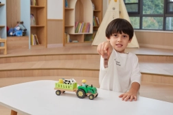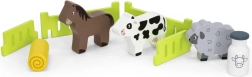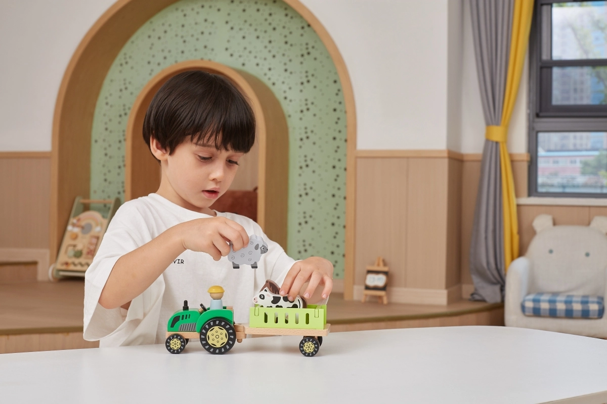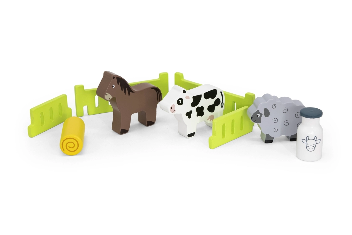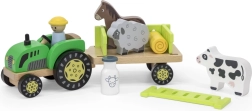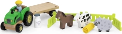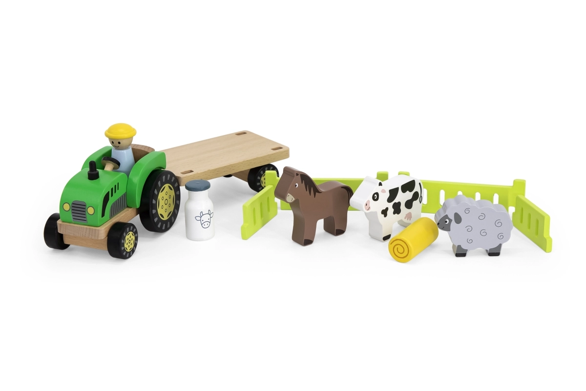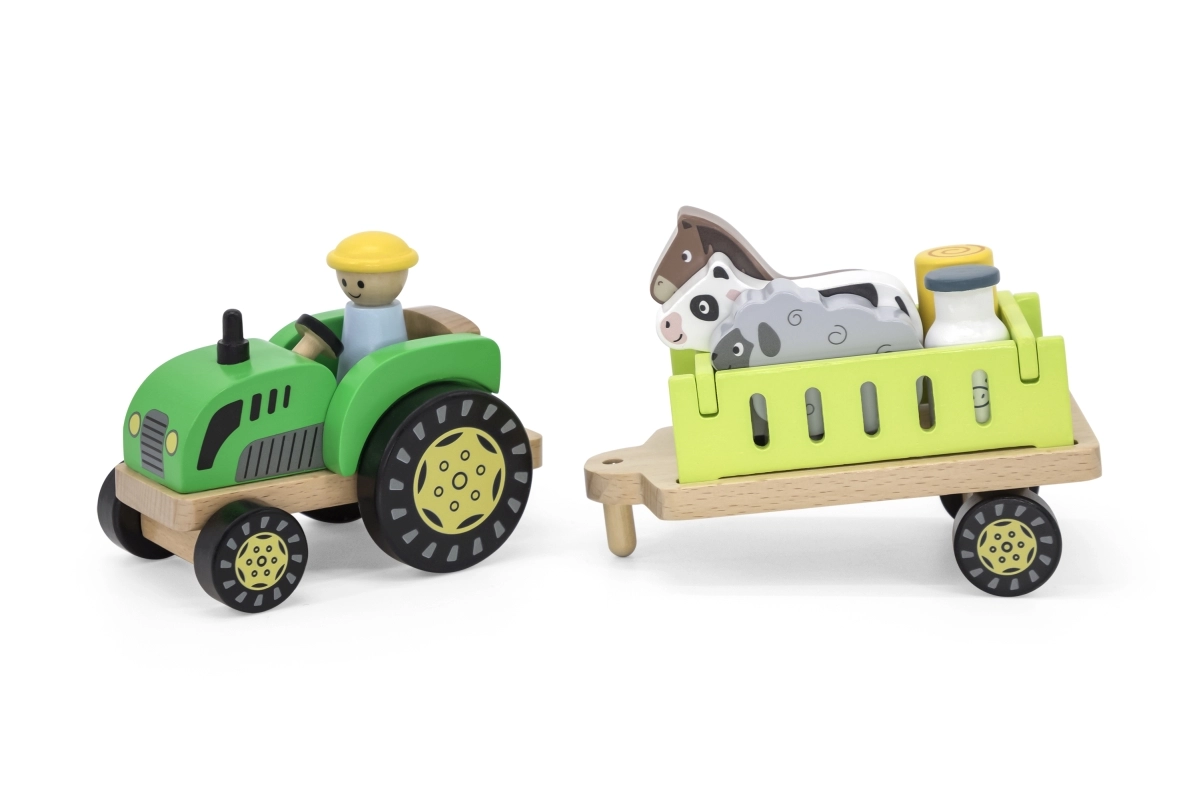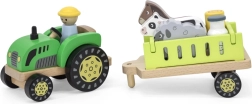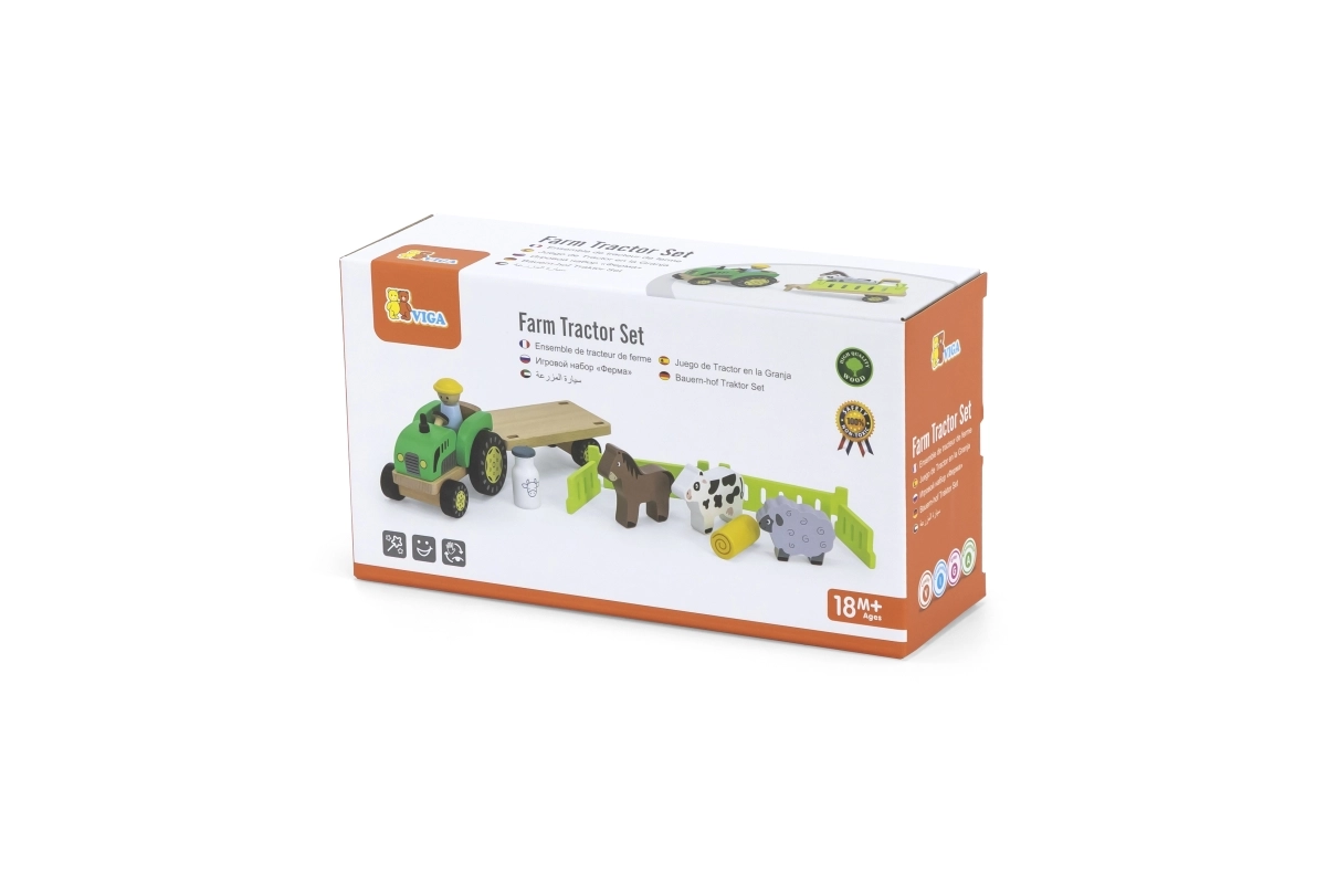 Дървеният трактор с животни от Viga Toys е чудесен за деца, които обичат да създават истории за живота във фермата. Страните на ремаркето могат да се преобразуват във фермерски плет, което още повече разширява възможностите за игра. Този комплект е подходящ както за групова, така и за самостоятелна игра.