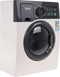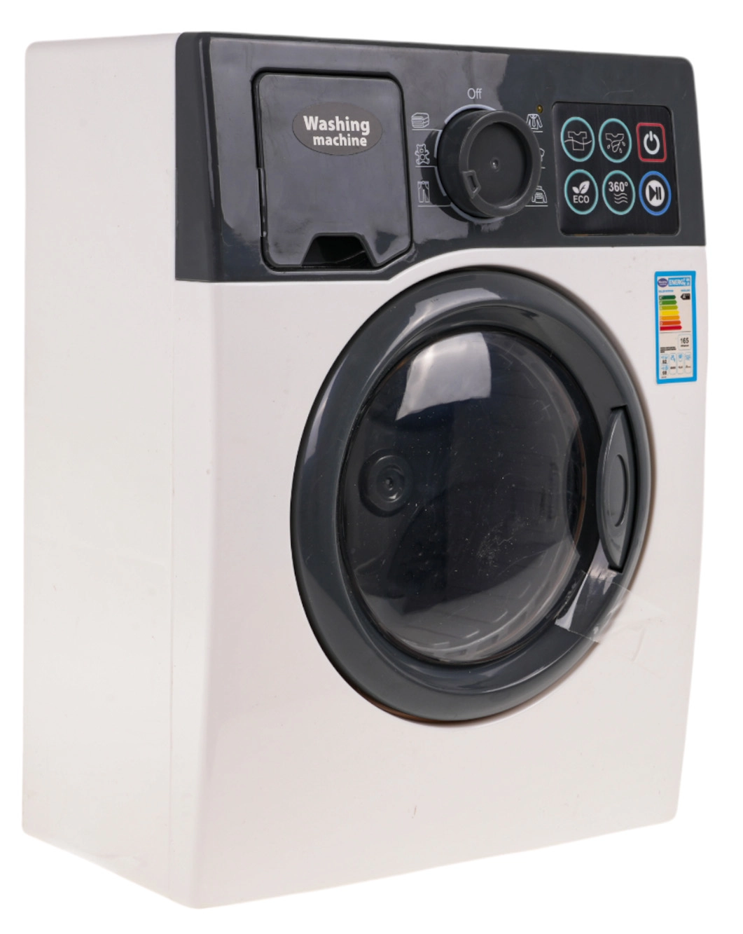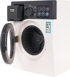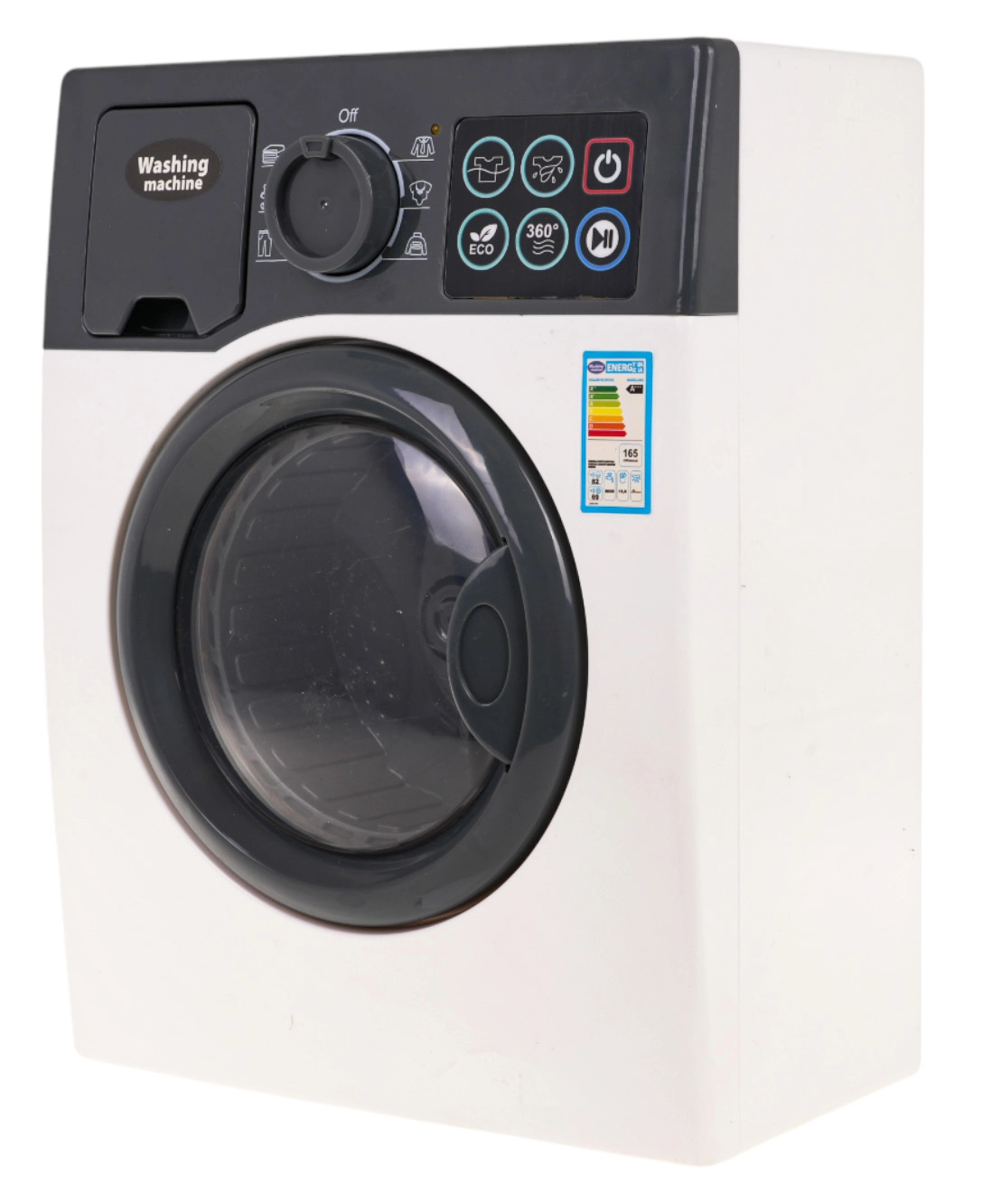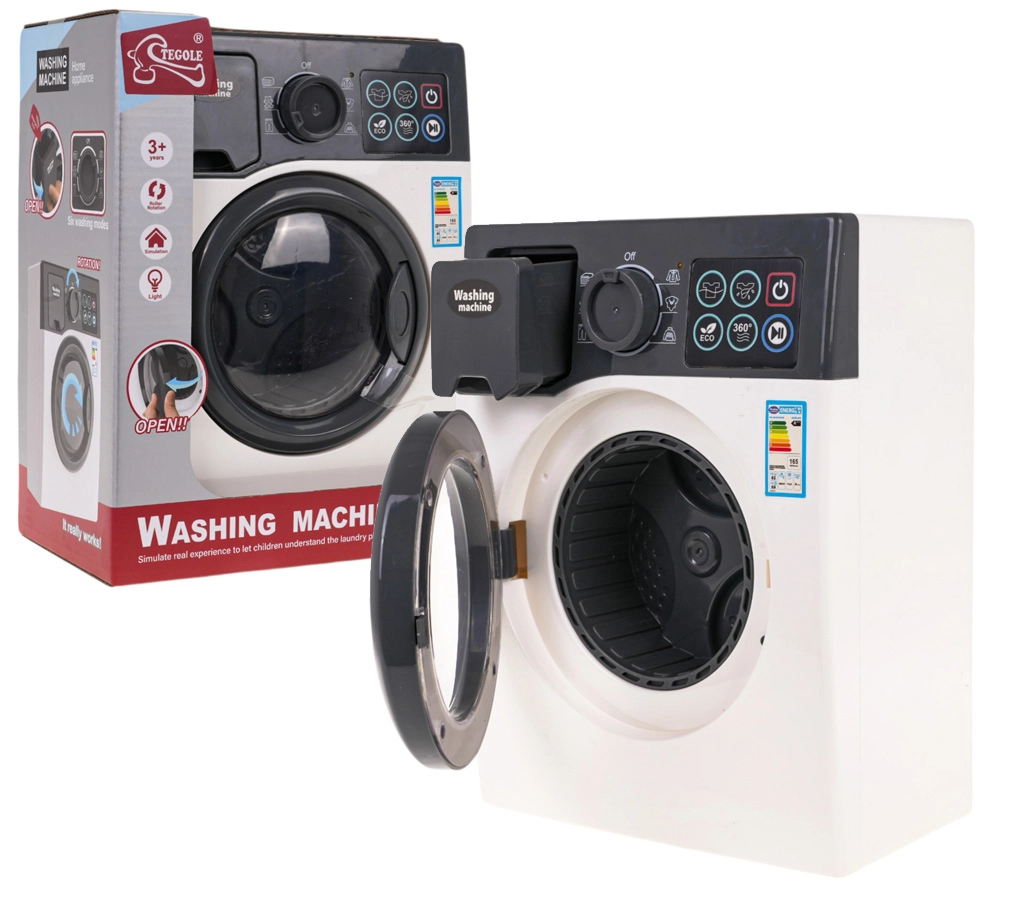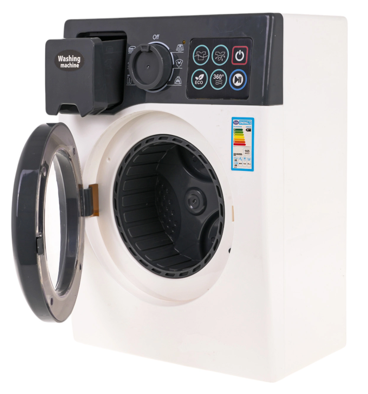 Тази голяма детска пералня достоверно наподобява истински уред и позволява на децата да „перат“ дрехи за кукли без използване на вода. Управлението се осъществява чрез бутони и въртящ се регулатор, като всяка програма издава различни звуци на пране, центрофугиране и източване на вода. Интегрираният LED диод придава допълнителен реализъм на играта.
