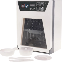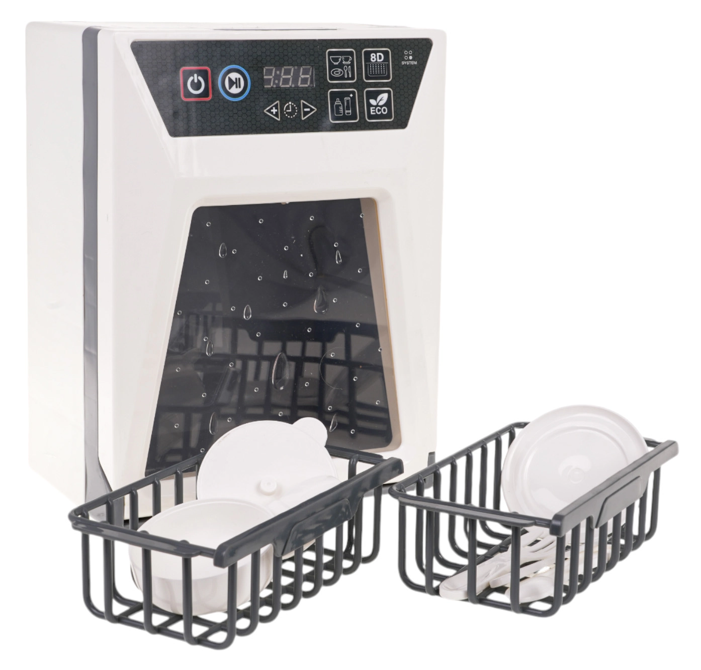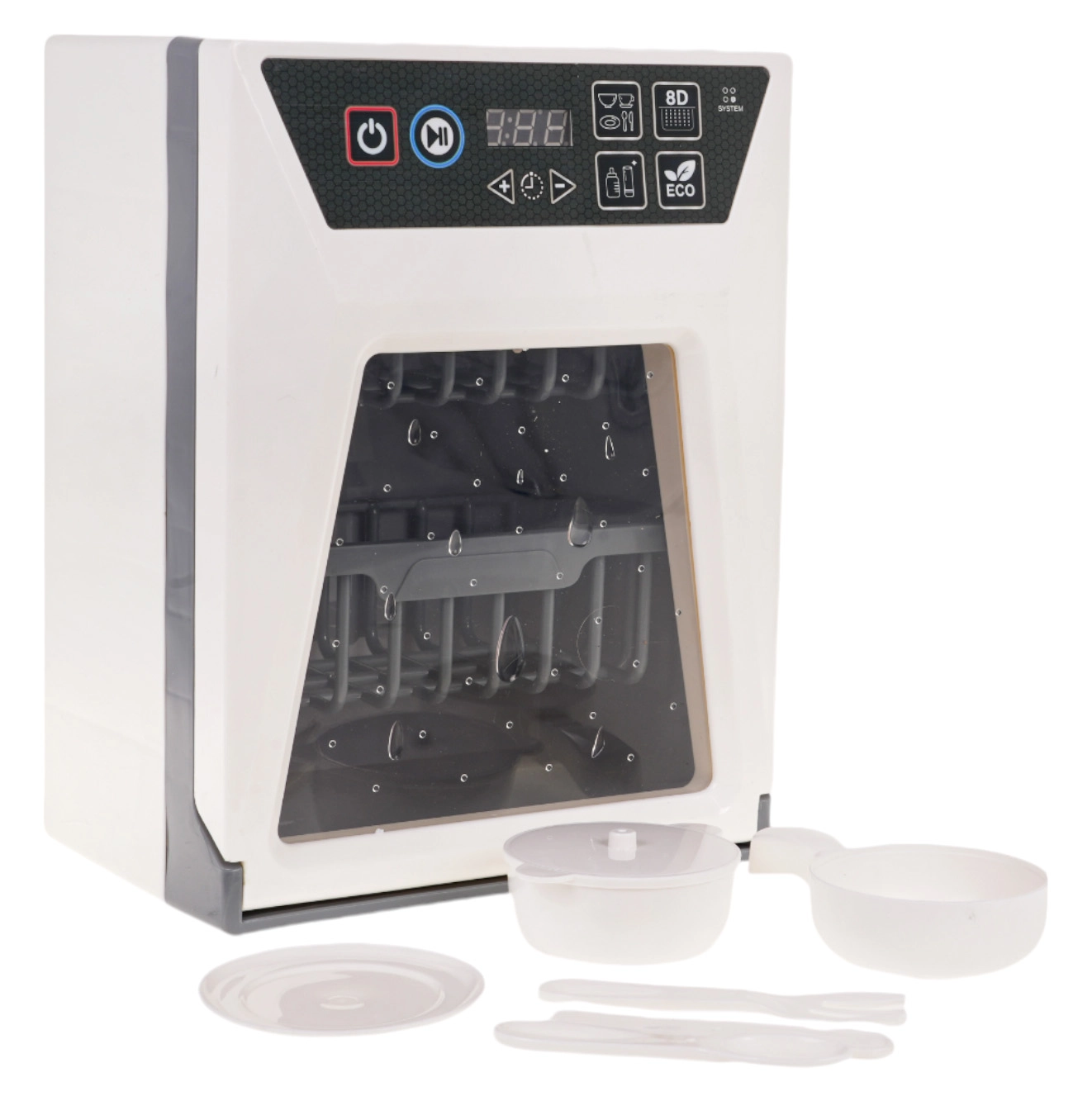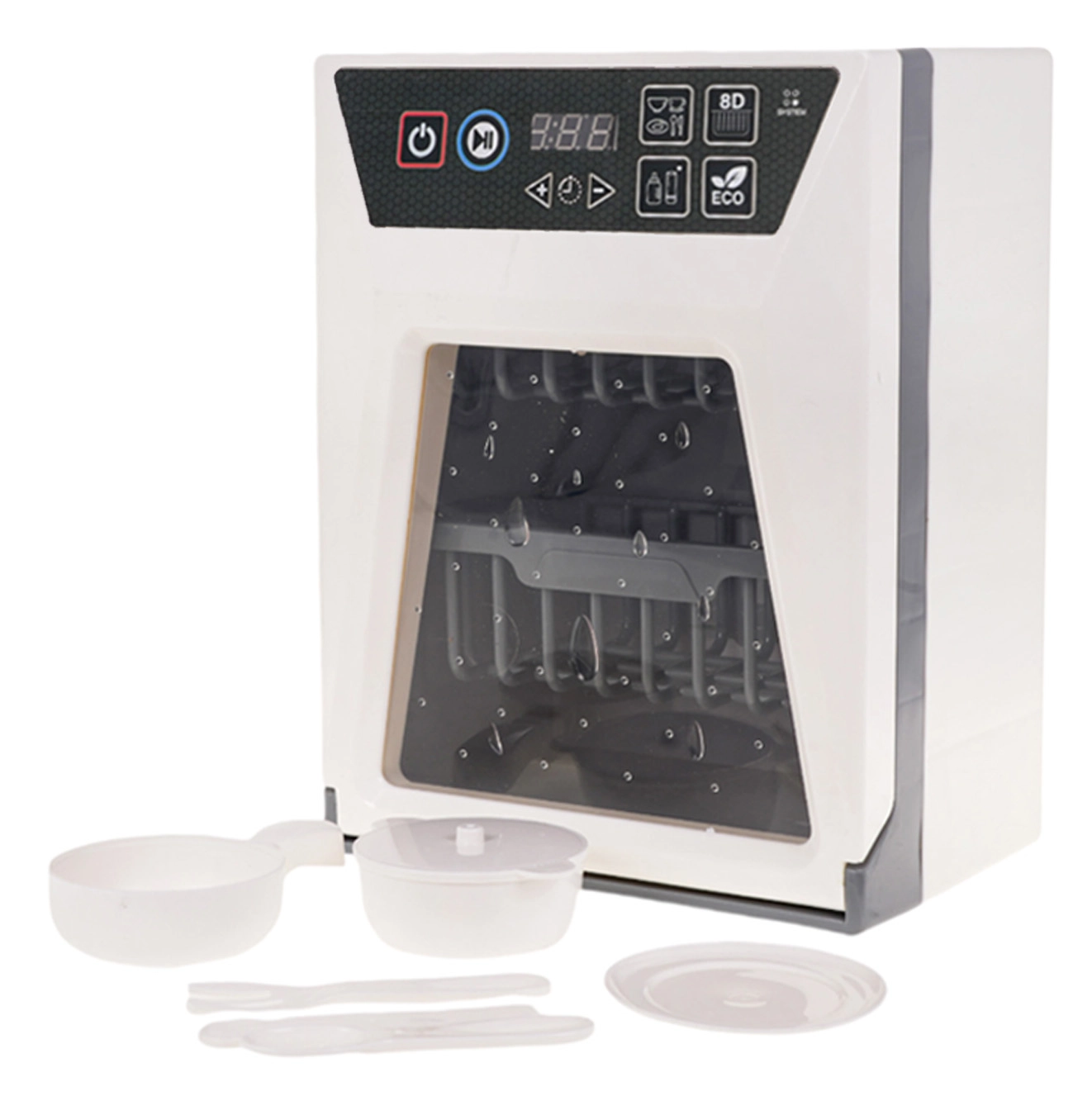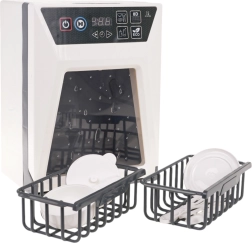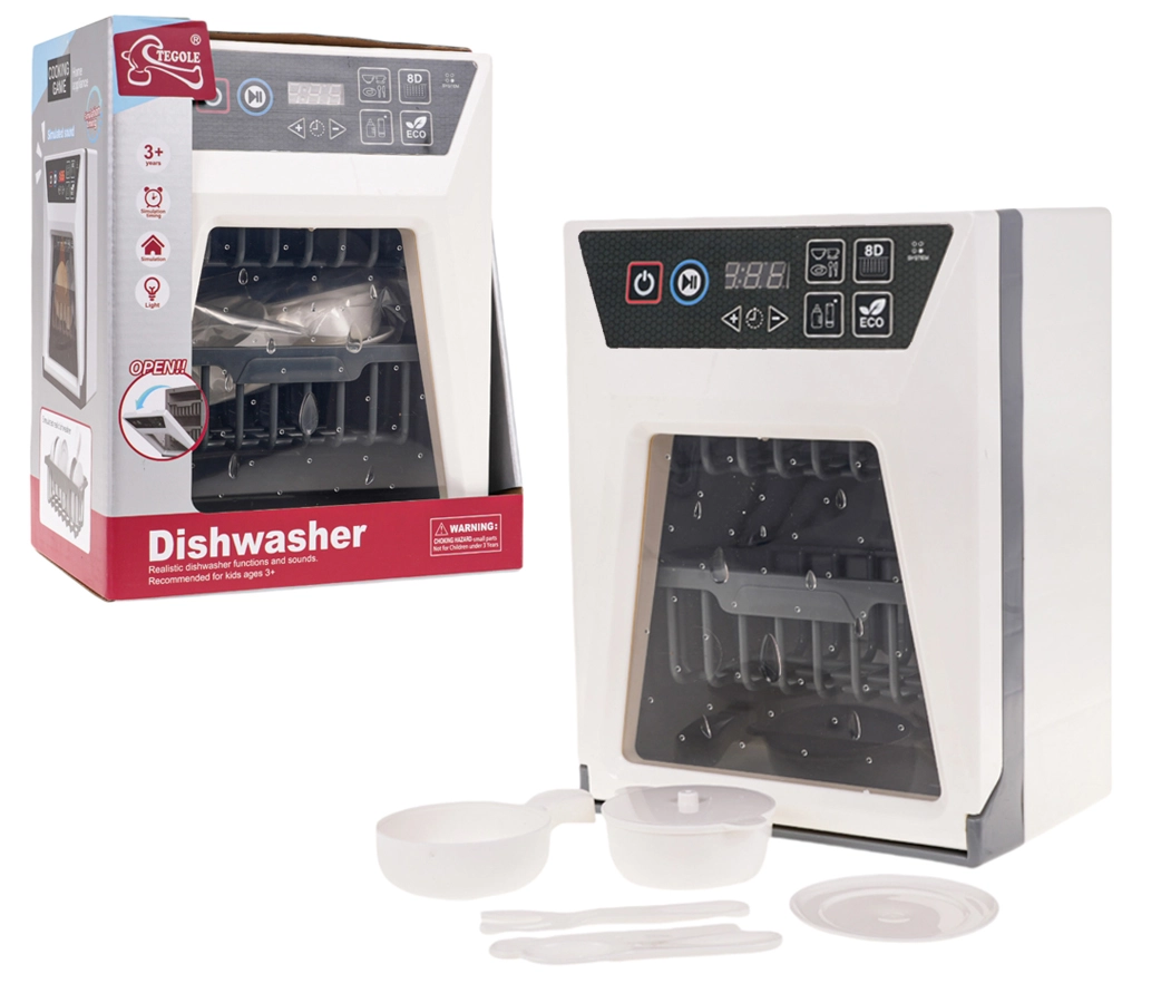 Реалистична детска съдомиялна с функционални светлини и звуци, която ще зарадва малките помощници от 3 години. Разполага с сензорен панел със старт, пауза и таймер на програмата, отваряща се вратичка и подвижна кошница. В комплекта има набор от аксесоари – чинийка, тенджера с капак, тиган и прибори. Захранване 2× AA (не са включени).