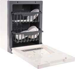 Тази интерактивна съдомиялна изглежда като истинска – с натискане на бутон на сензорния панел се стартира избраната програма, светлините се включват и се чуват реалистични звуци. Вратичката се отваря и вътре поставяте подвижната кошница за съдове. Благодарение на ясния дисплей с обратно броене децата лесно следят хода на „миенето“.