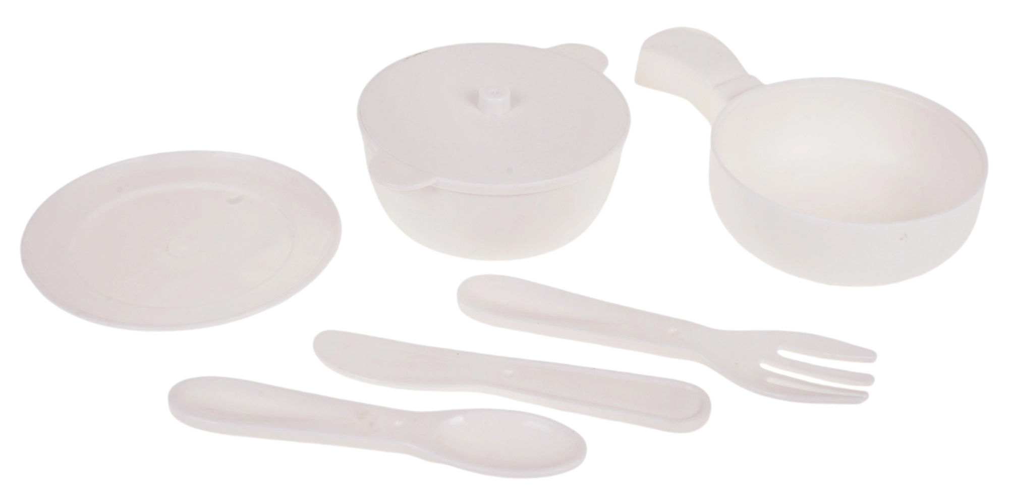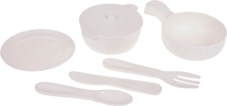 - съдомиялна, чинийка, тенджера с капак, тиган, нож, вилица, лъжичка