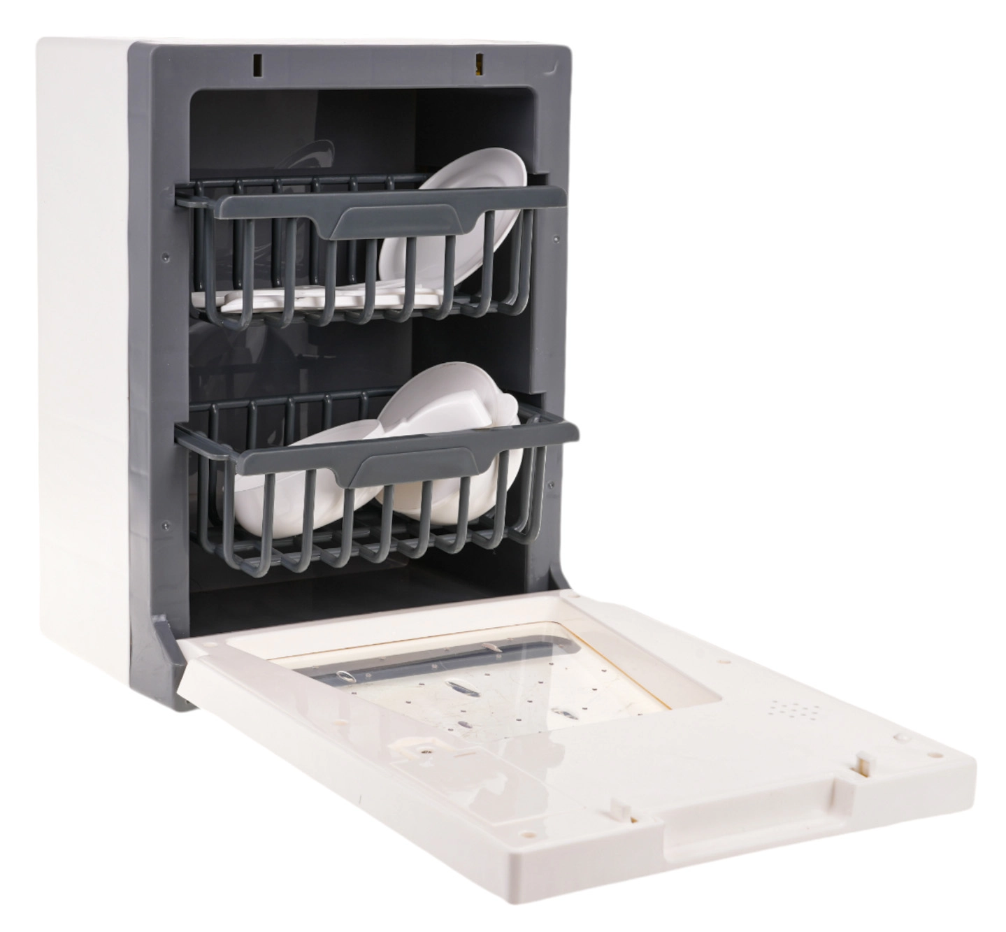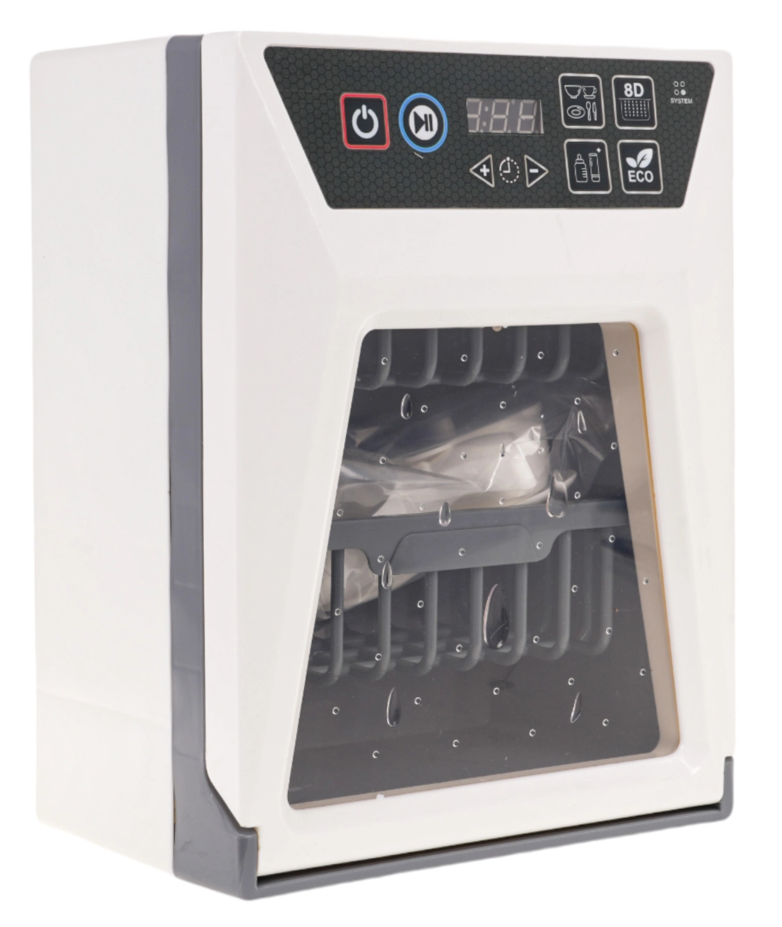След стартиране на програмата светват контролни лампички и се чуват характерни звуци на съдомиялна – изживяване като при истински уред.