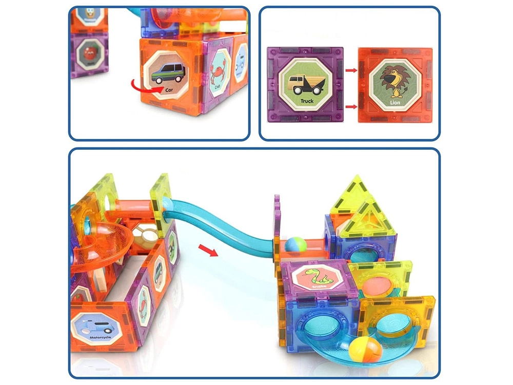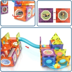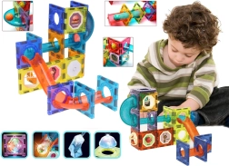 Постройте за децата свят, изпълнен с цветове и движение! Този креативен комплект магнитни елементи с полупрозрачни панели позволява сглобяване на тунели и пързалки, по които се търкалят топчета. Частите на конструктора са допълнително подсветени, така че играта изглежда страхотно и на тъмно. Благодарение на силните магнити, безопасните заоблени елементи и безкрайните възможности за строене децата ще се забавляват с часове и ще развиват въображението си.