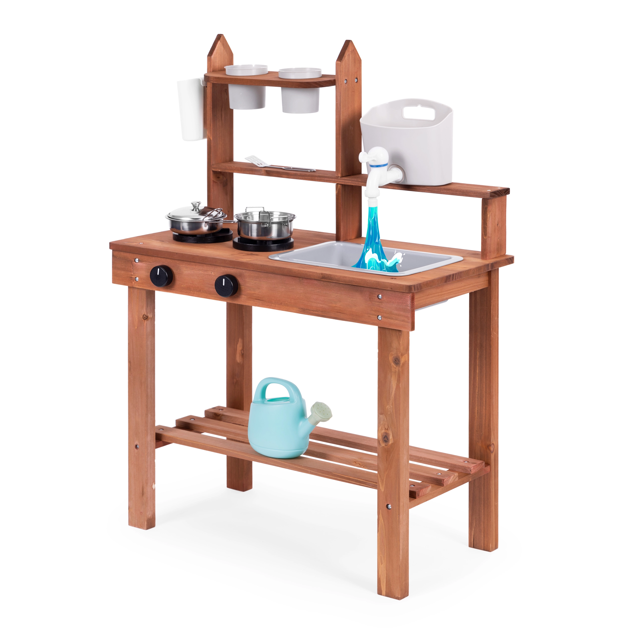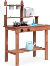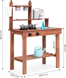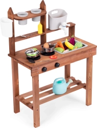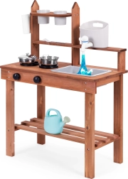 Подпомага ролева игра и позволява на децата да „готвят“ от пясък, пръст или камъчета. Подредените рафтове и куки държат съдовете под ръка, а компактните размери улесняват разполагането дори в по-малки пространства.