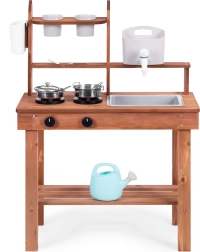 Тази здрава кална кухня внася реалистично готвене в детския свят. Благодарение на резервоара с функционален смесител малките готвачи имат на разположение истинска вода, два котлона с въртящи се копчета и богати метални аксесоари. Естественото елово дърво устоява на игри в градината, на терасата и в детската стая.