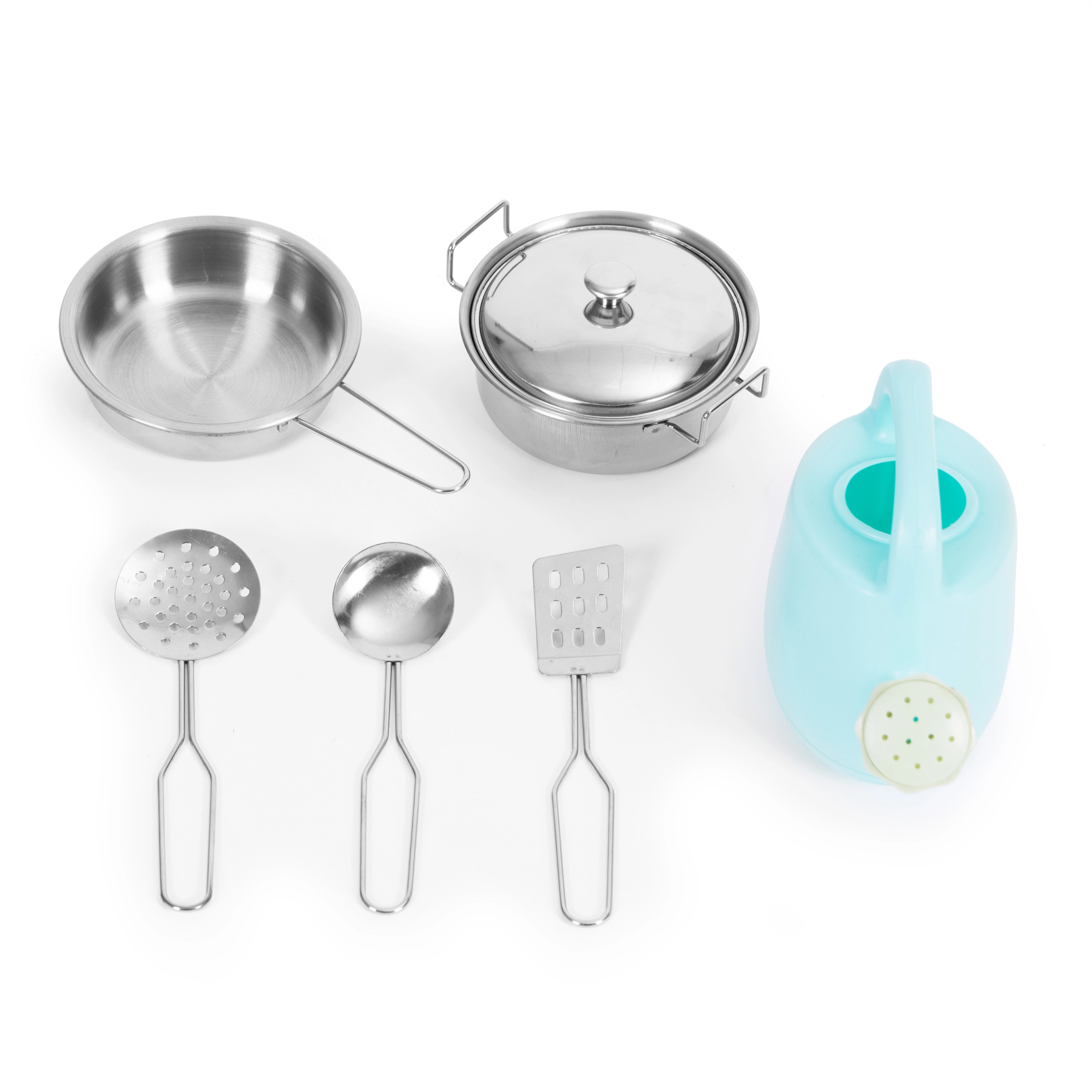 Включени са тенджера с капак, тиган, две шпатули, черпак и малка кана – всичко необходимо за малки кулинарни експерименти.