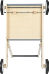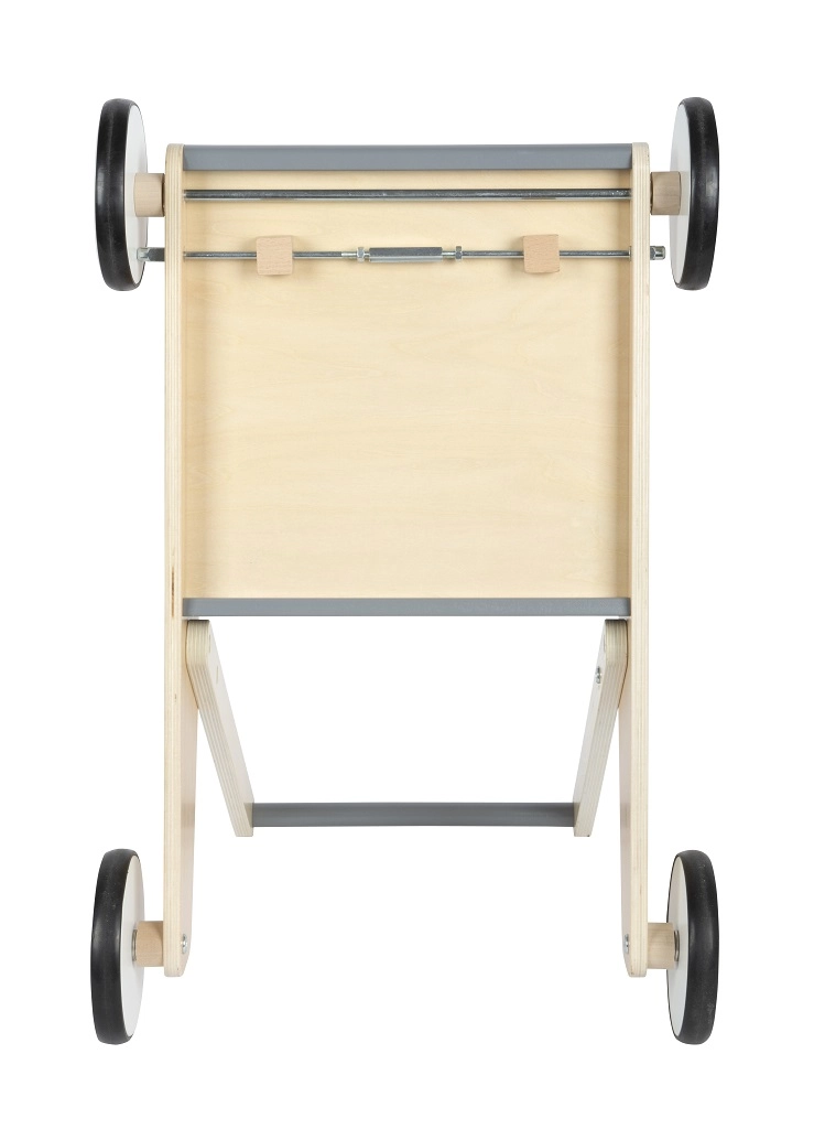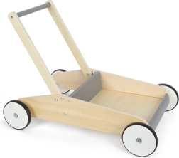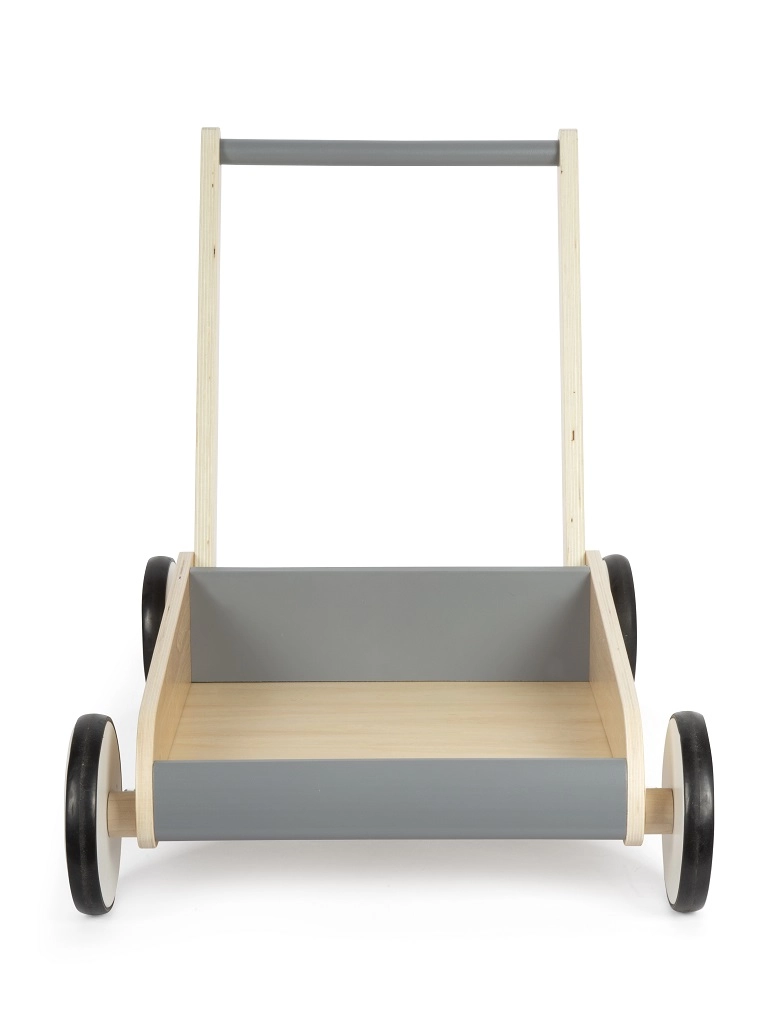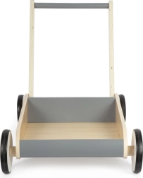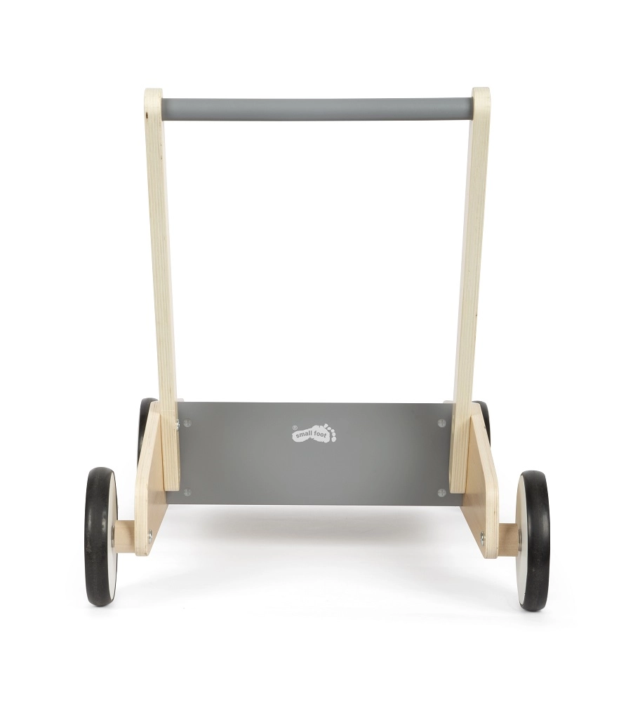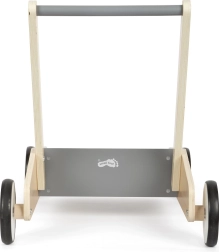 Открийте надежден партньор за първите стъпки. Здравата конструкция от висококачествен ламиниран дървен материал в комбинация с шистено сиви елементи осигурява увереност, безопасност и модерен вид. Заоблените ръбове и гумираните колела са щадящи за детските ръце и подовете, докато спирачната система помага да се поддържа спокойно темпо при ученето да се ходи.