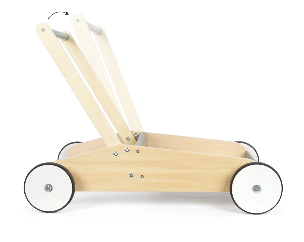 Практичното място за съхранение побира незаменими играчки и аксесоари за ежедневните обиколки из дома. Регулируемата по височина дръжка (2 нива) расте с детето и подпомага правилната стойка и развитието на равновесието и фината моторика.