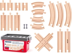 Практичният комплект съдържа 20 броя дървени релси за влакчета, съхранени в здравa пластмасова кутия за лесно съхранение. Идеално разширение за детски влакчета, подходящо от 3 години и с CE съответствие.