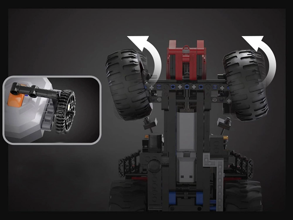 Два мотора M, мотор L и прецизен серво механизъм осигуряват движение напред/назад и точно управление. Повдигайте задния теглич и завъртайте захвата на 180° от разстояние.