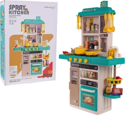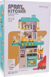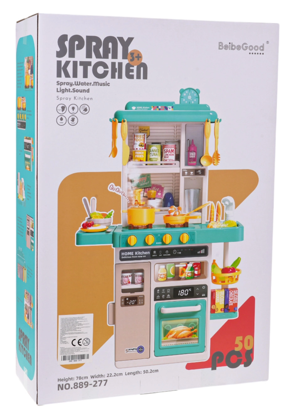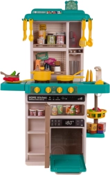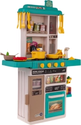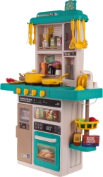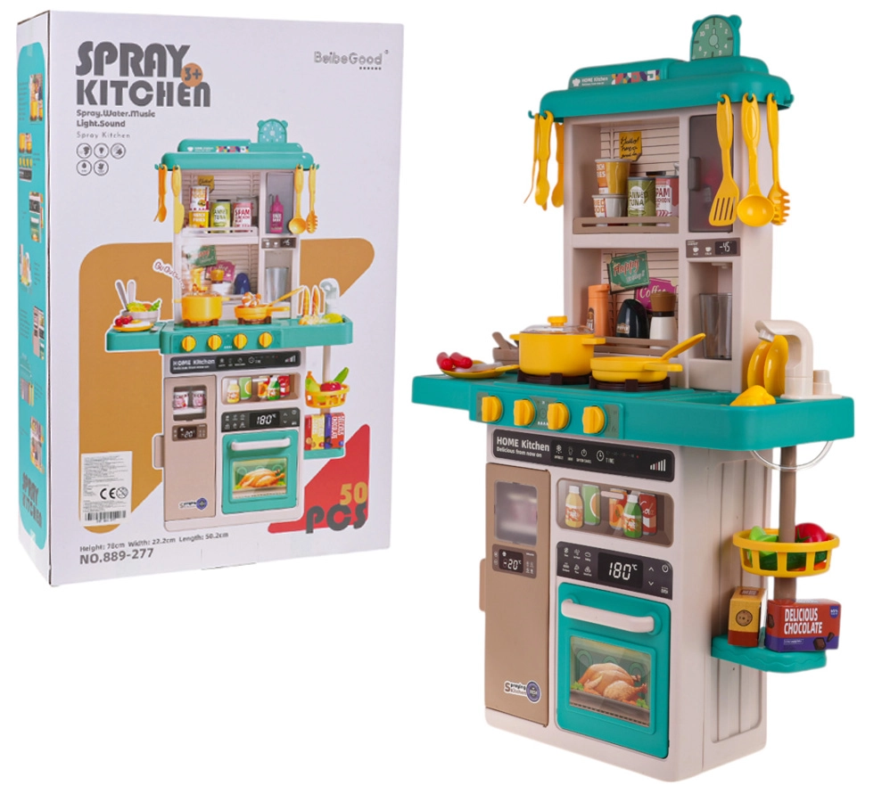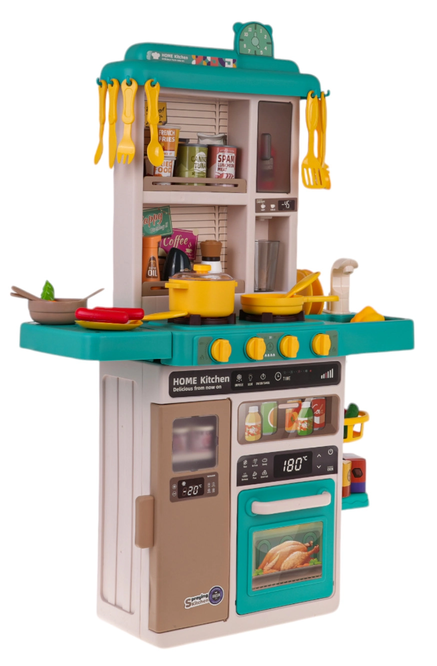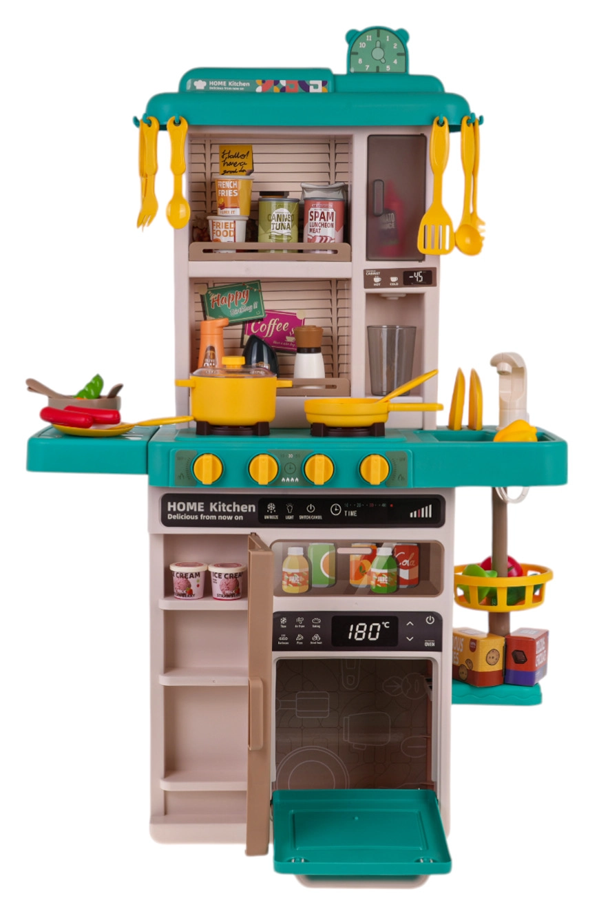 Развийте детското въображение с интерактивна кухня, която предлага светлинни ефекти, реалистични звуци на готвене и пържене, течаща вода от чешмата и дори безопасна водна пара от котлона. Богатият комплект от 50 части, качествената пластмаса и живите цветове правят тази кухня идеална играчка за деца от 3 години.