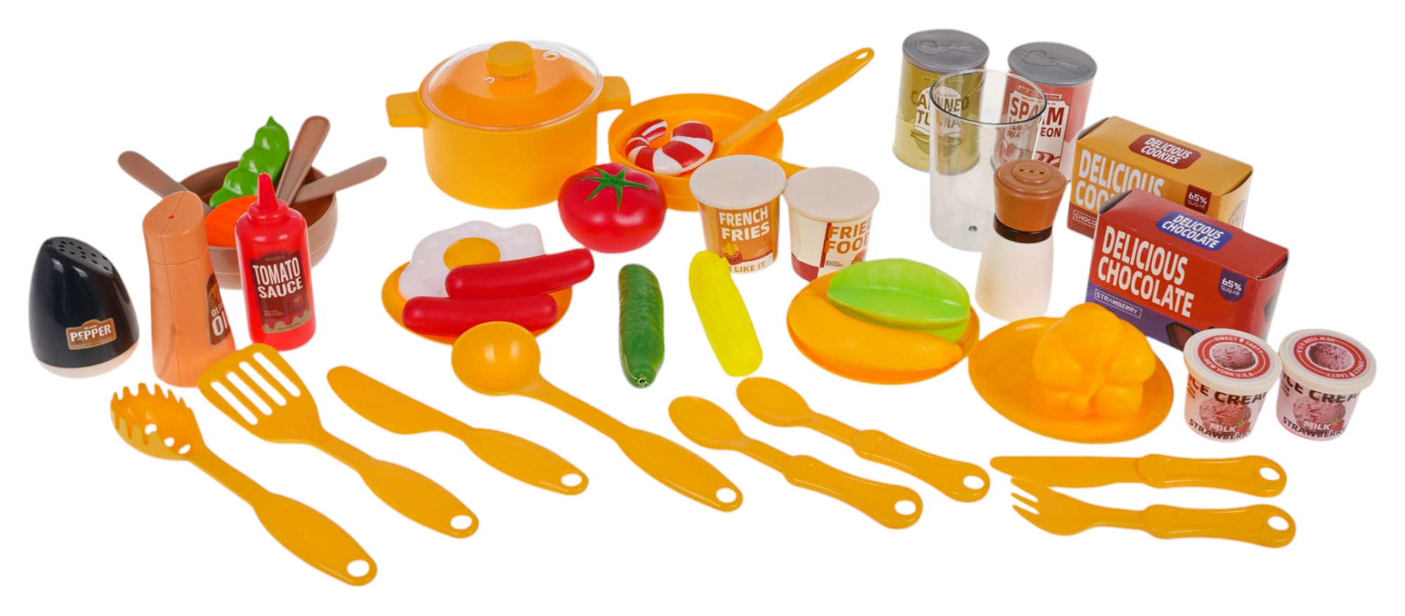 - Кухня, тиган, тенджера с капак, купичка, прибори и принадлежности, чинии, подправници, сосове, чаша, десерти, консерви, аксесоари за фастфуд, макети на храни (чушка, домат, лист салата, резени морков и чушка, скарида, яйце на очи, кренвирши, банан, грах, краставица)