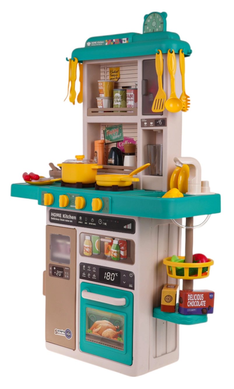 - Светлинни ефекти на котлоните, звуци на готвене и пържене, безопасна водна пара, течаща вода от чешмата, въртящи се копчета, отваряеми „хладилник“ и фурна