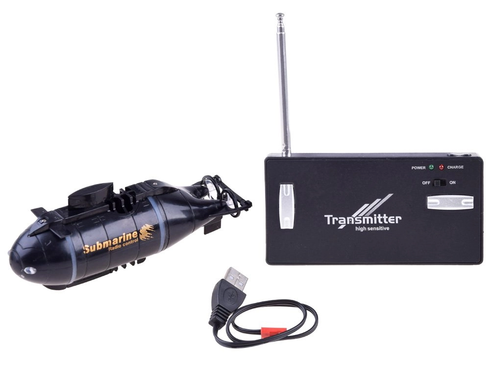 Контролерът служи не само за управление, но и като практично зарядно – достатъчно е да свържете вградения кабел към предната част на подводницата. За по-дълга игра в комплекта е включено и USB зарядно. Двете LED светлини отпред повишават видимостта и придават автентичен вид.