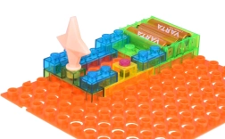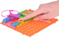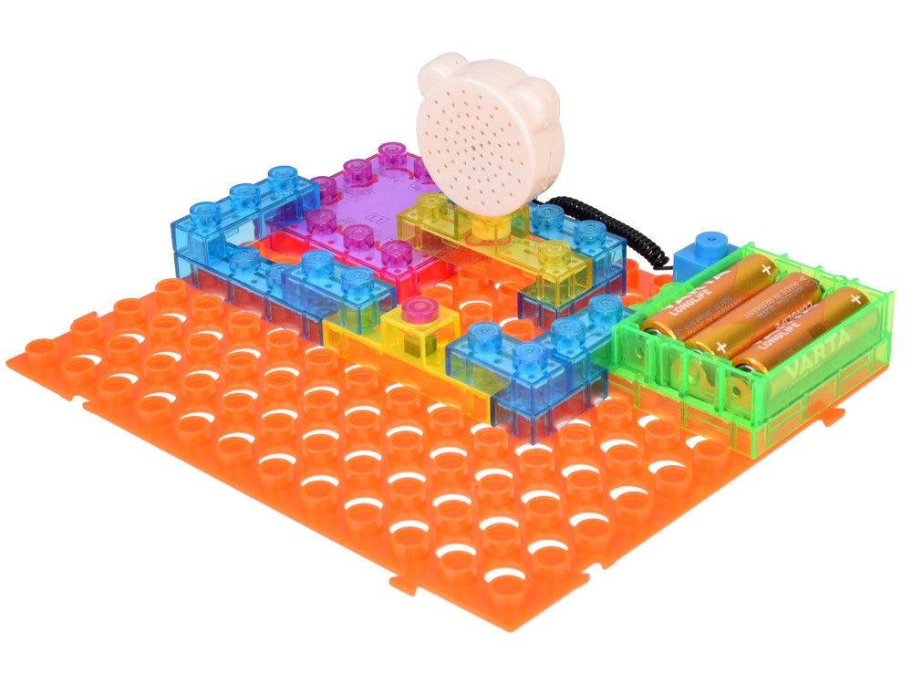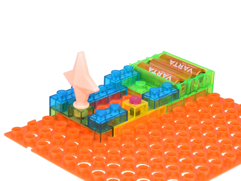 Прозрачните цветни модули се свързват лесно върху стабилната базова платка. Означенията на частите улесняват правилната ориентация и предотвратяват грешки.