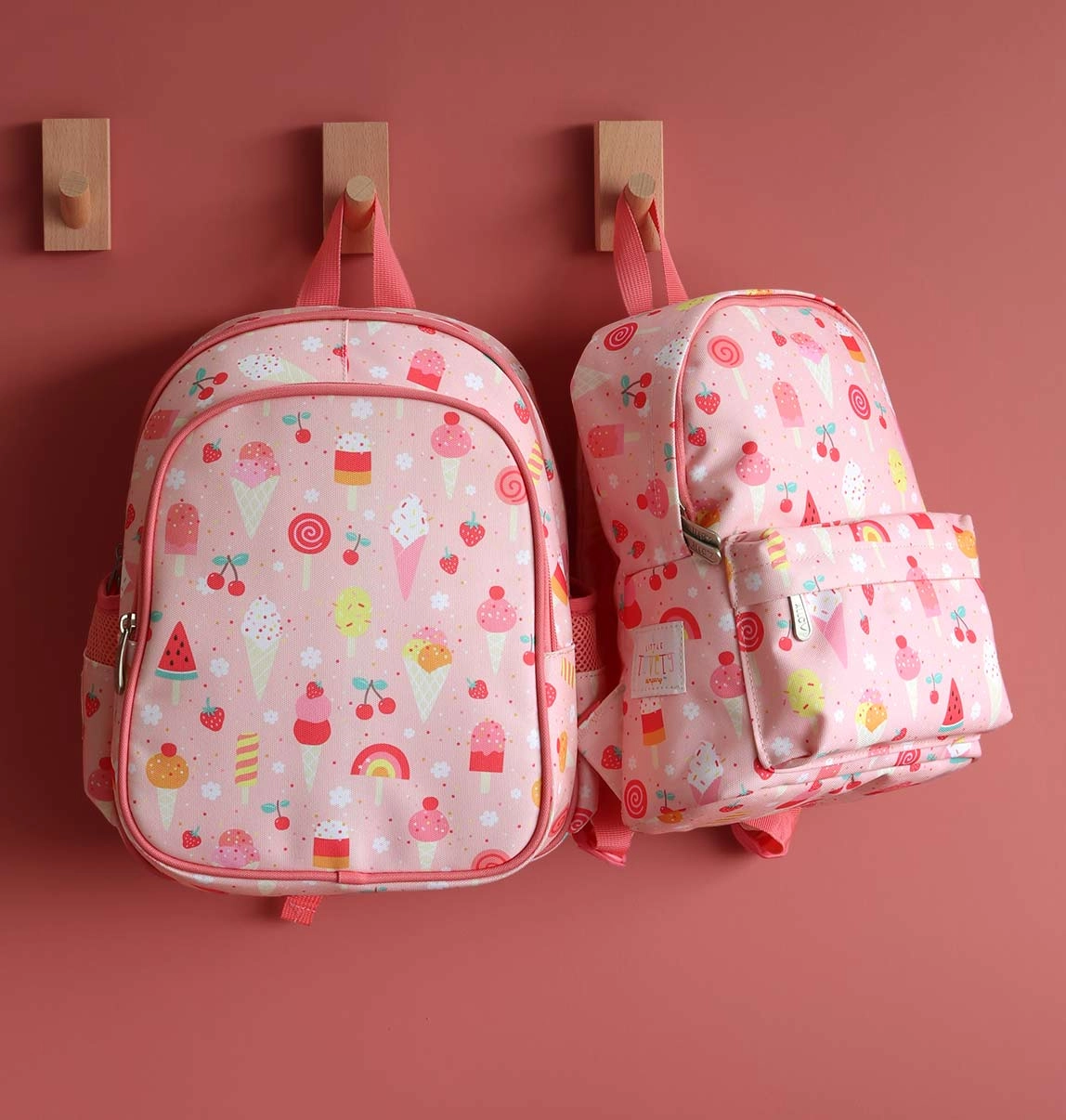 Очарователна и практична детска раница с мотив сладолед, идеална за детска градина и екскурзии. Предлага просторно основно отделение, изолиращ преден джоб за закуска, два странични джоба за бутилка и подплатени презрамки с гръден колан за удобно и безопасно носене.