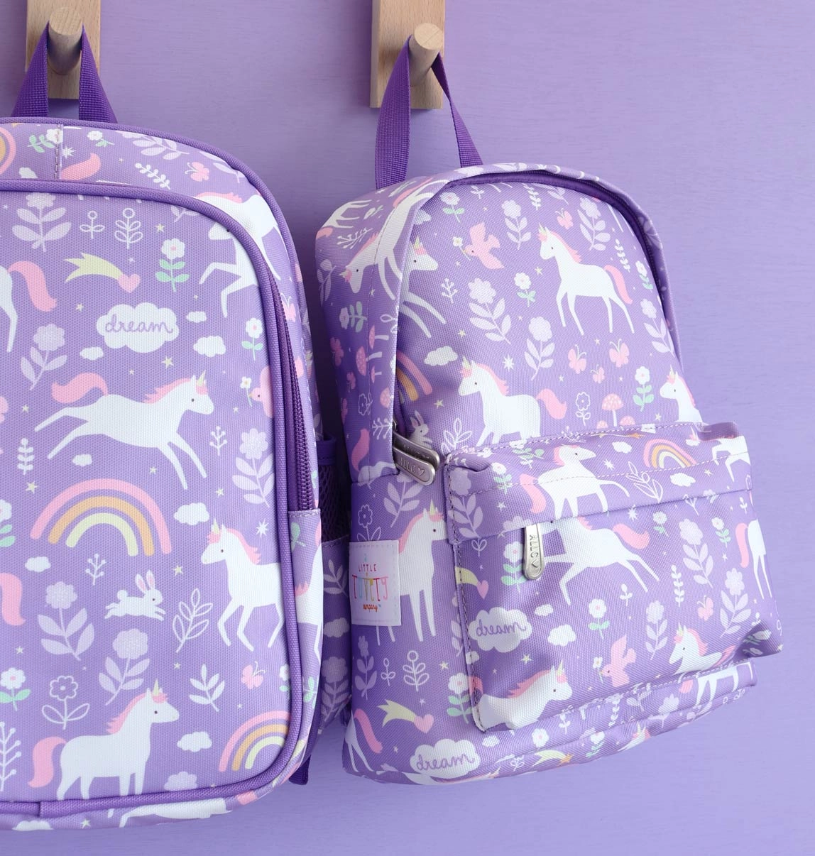Гръдният колан помага презрамките да останат на място, така че раничката стои стабилно дори при тичане и игри. Цветният принт с еднорози и дъга превръща раничката в стилен спътник за малките приключенци.