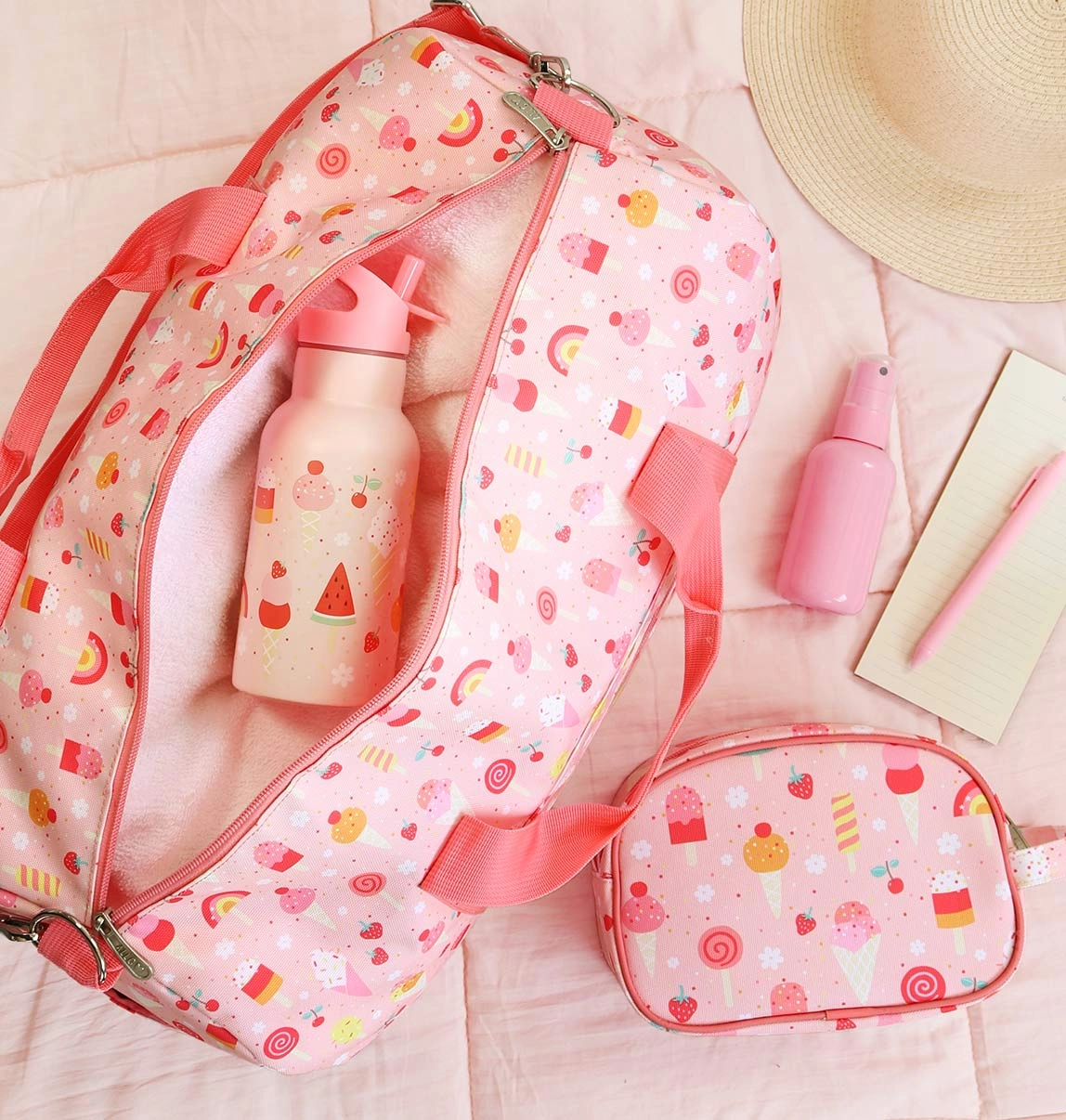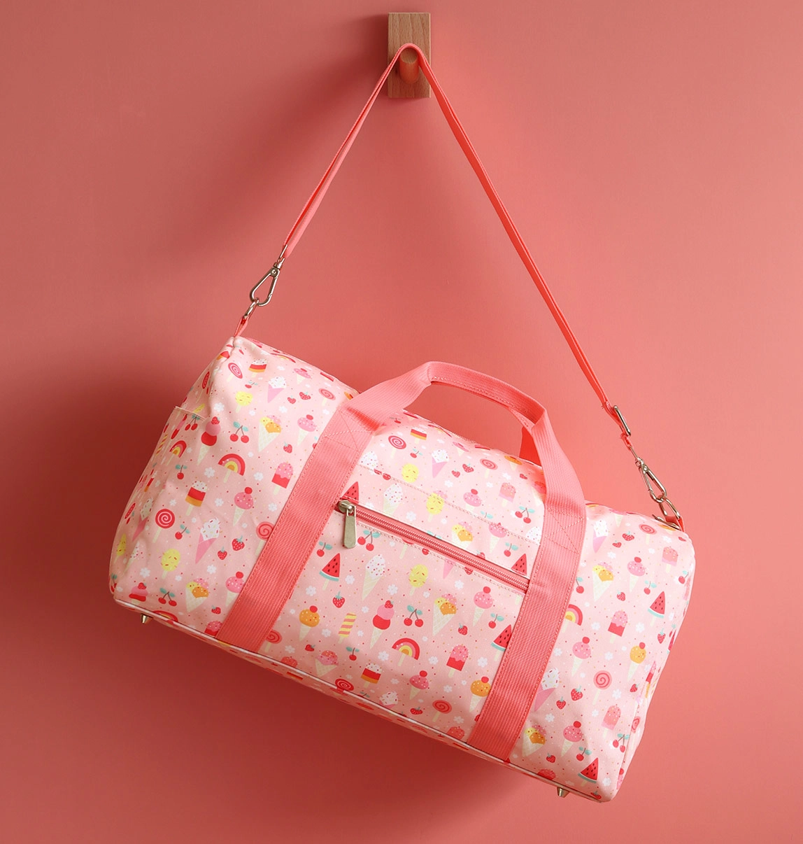 Стилна и просторна детска пътна чанта от A Little Lovely Company, идеална за спорт, занимални и уикенд пътувания. Разполага с основно отделение с допълнителен джоб, два странични джоба и преден джоб с цип. Лекият и здрав полиестер с цветен принт, сваляемият раменен ремък и двете дръжки за носене в ръка осигуряват удобно ползване. Обемът от 26 литра побира всичко необходимо и чантата е чудесна и като ръчен багаж за самолет.