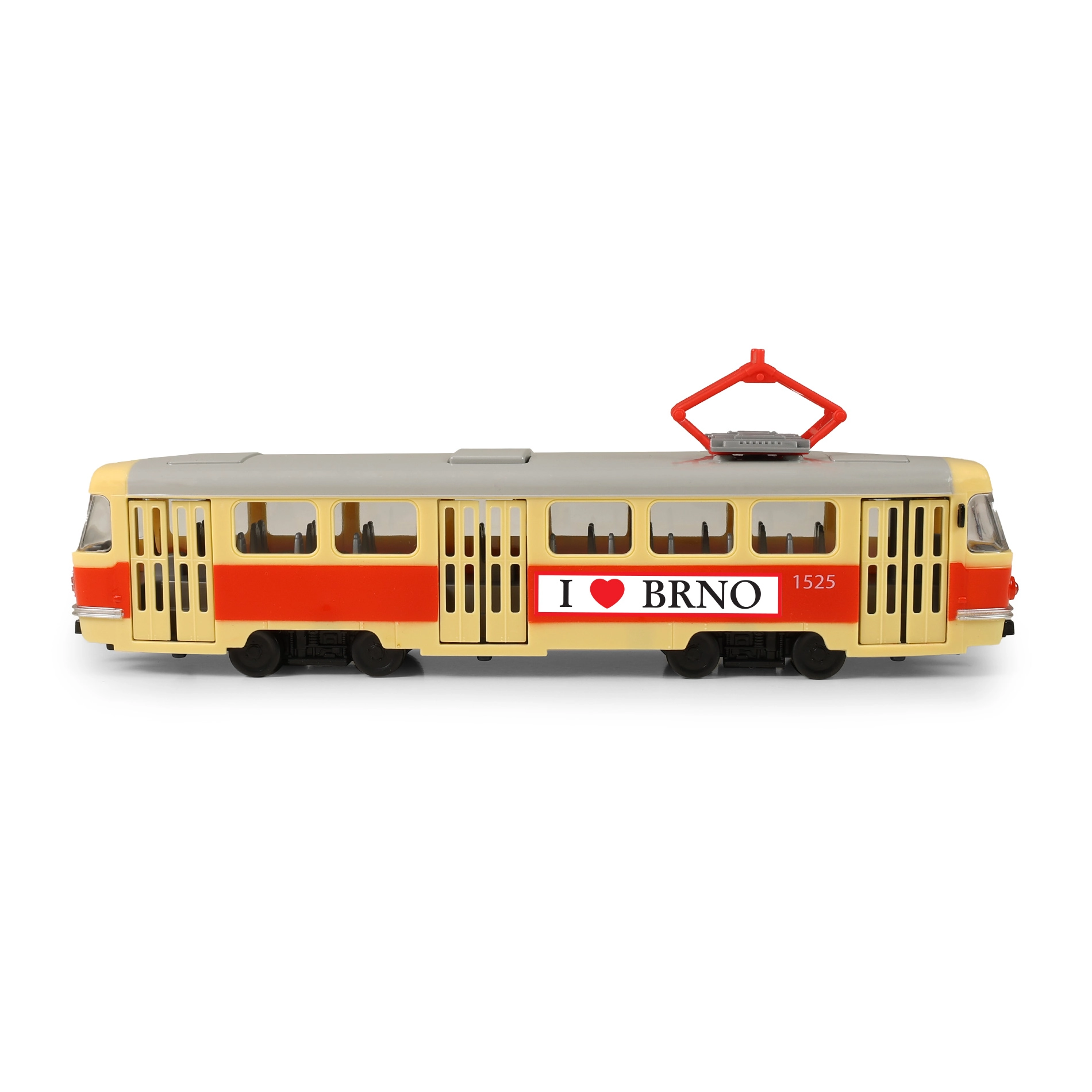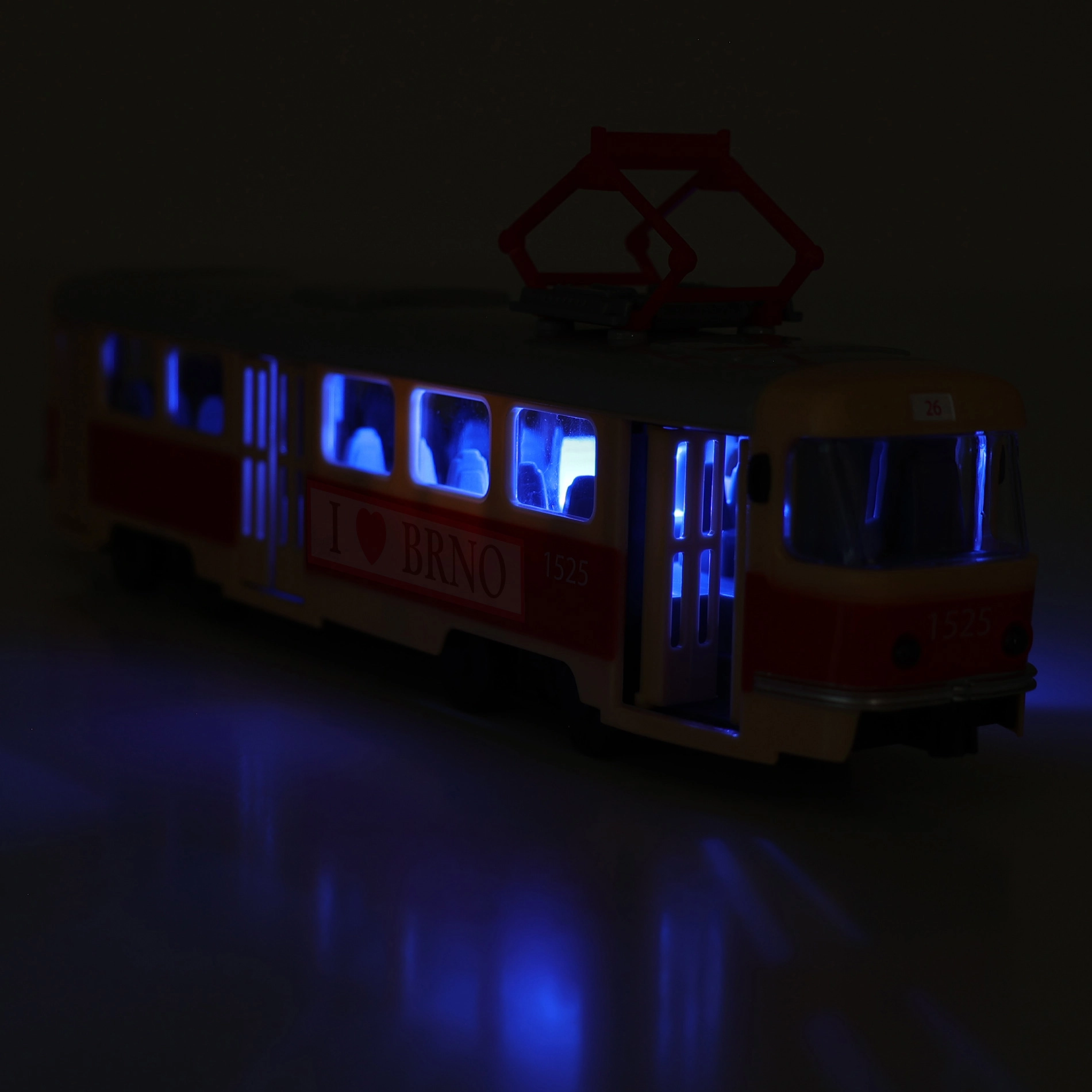 Открийте забавния и детайлно изработен трамвай T3 с мотив от БРНО, който ще зарадва малки и големи фенове на градския транспорт. При всяко отваряне на вратите прозвучават автентични съобщения за спирки на чешки език, а при затваряне трамваят обявява следващата спирка. Отварянето на предните врати допълнително активира синьо вътрешно осветление, което засилва реалистичното усещане по време на игра.