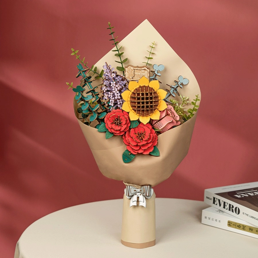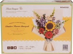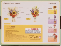 Открийте чара на букет, който никога не губи своята красота. Дървеният 3D пъзел включва слънчоглед, люляк, червена камелия, розова роза и евкалипт. Всяко цвете има регулируема височина на стъблото, което позволява разнообразни аранжименти.