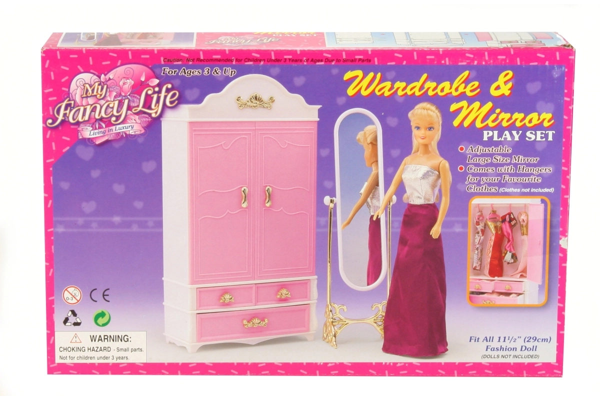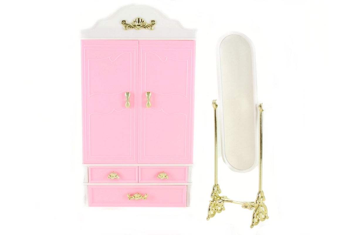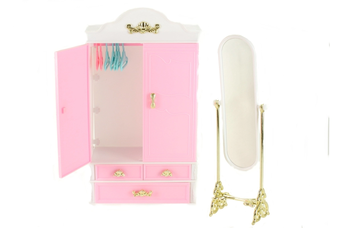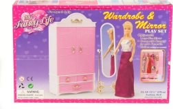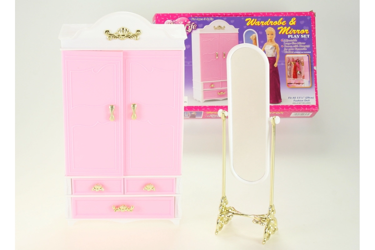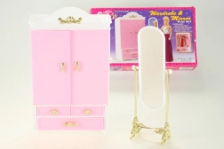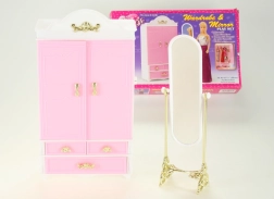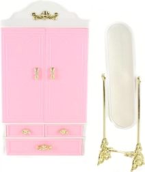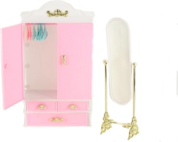 Добавете към детската игра гардероба и огледалото Glorie, които идват с ясен дизайн и функционалност за нейните кукли. Децата могат да се радват на подреждането на дрешките с необходимата грижа благодарение на практичните закачалки, докато огледалото добавя нотка елегантност към игровата сцена.