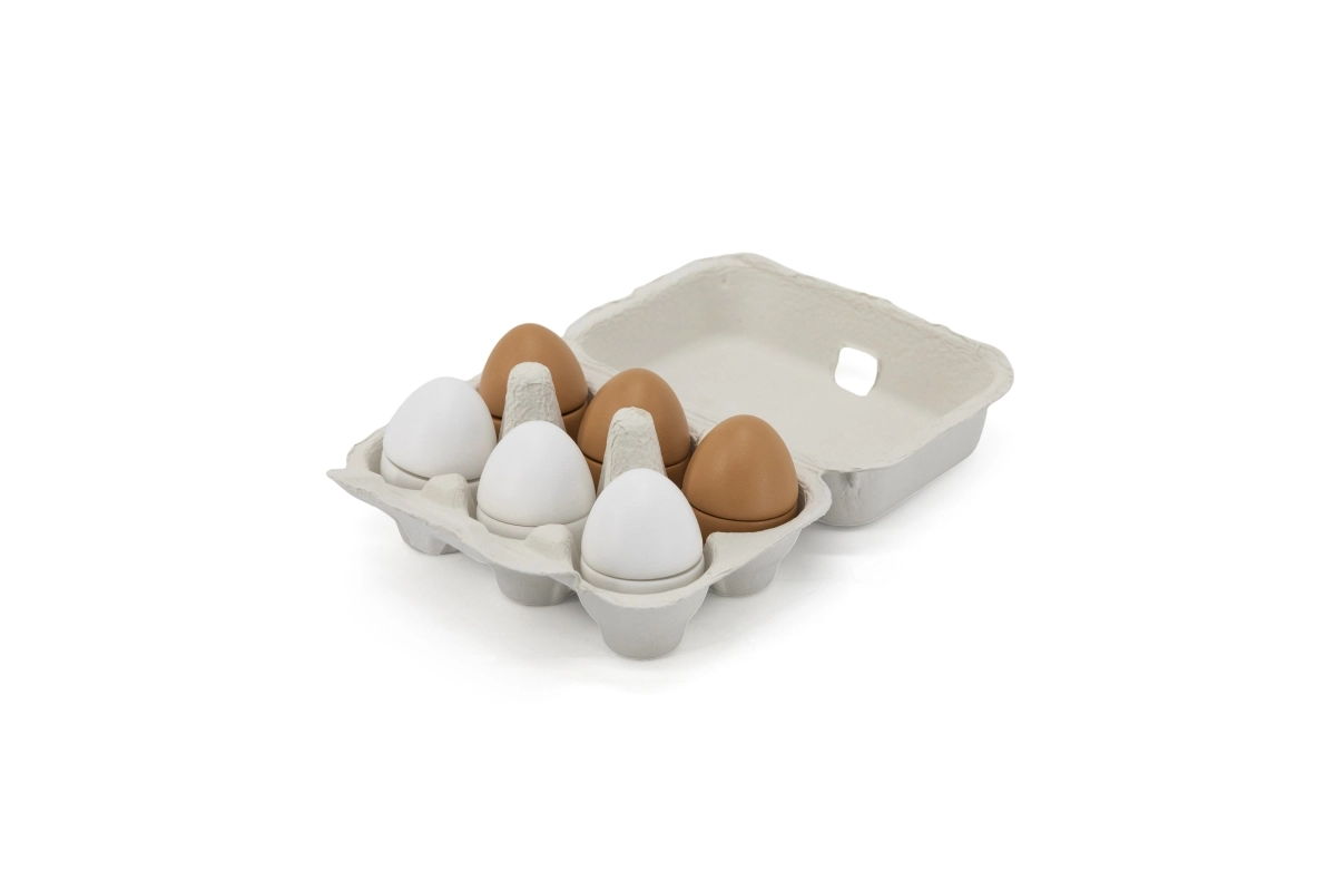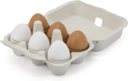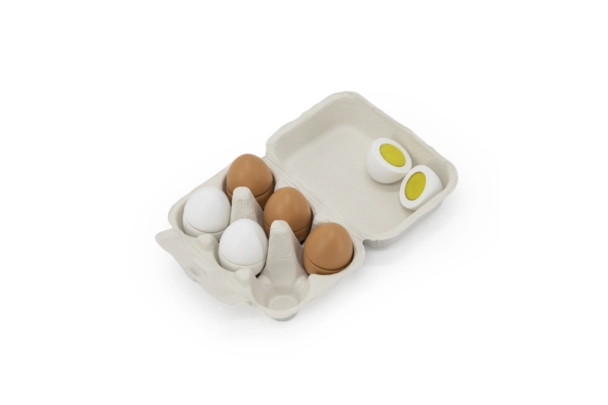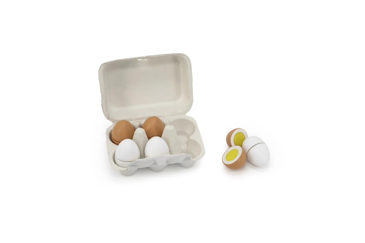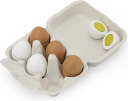 Този чудесен комплект дървени яйца позволява на децата да имитират възрастните и да развиват интерес към кулинарията. Идеален е за детски кухни или магазинчета. Всяко яйце е свързано с велкро и може да бъде разполовено, което дава възможност за симулация на готвене. Забавлението и изобретателността са гарантирани!