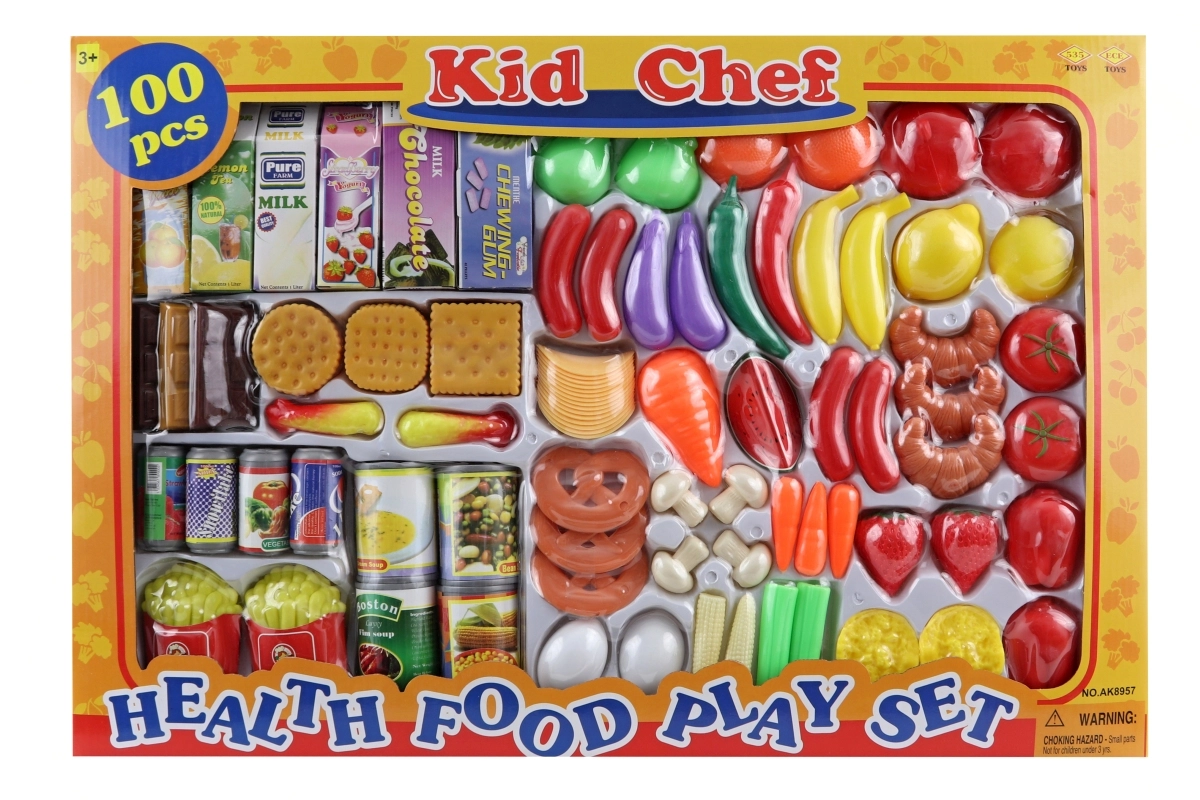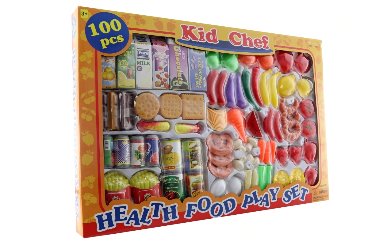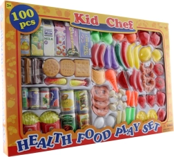 Открийте забавна и пъстра игра на кухня с този голям комплект храна за деца. Опаковката съдържа 100 елемента, включително плодове, зеленчуци, тестени изделия, сладкиши и консерви и картонени напитки. Идеален за развитие на въображението, учене на цветове и форми и съвместна игра. Подходящ за деца от 3 години.