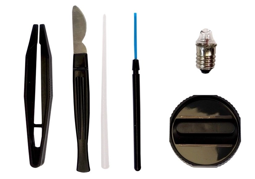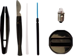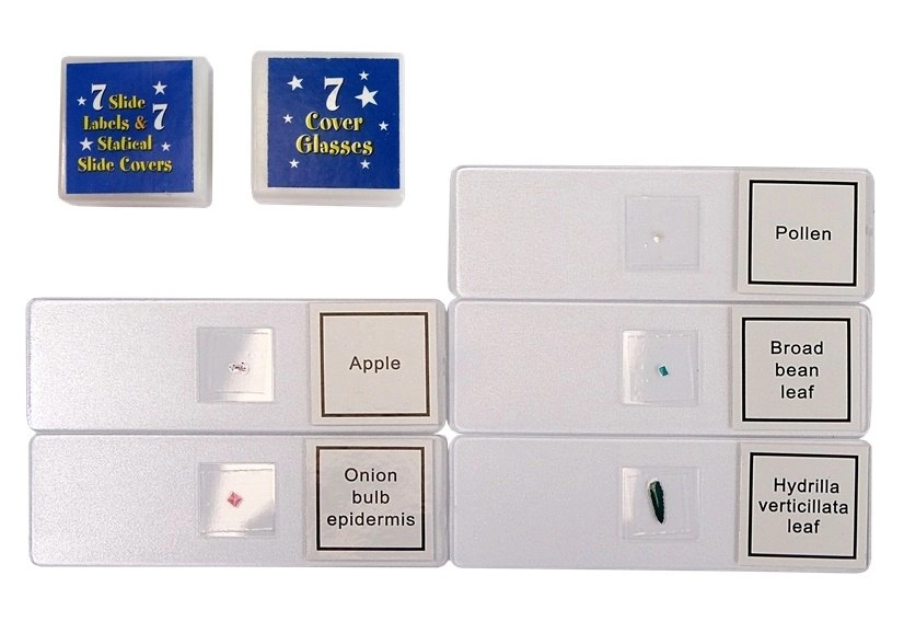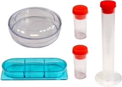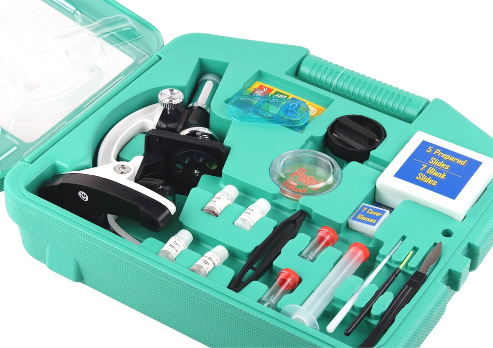 В комплектa има богати аксесоари за работа с проби: предметни стъкла, пинсета, инструменти за манипулиране, епруветки, петри паничка и пробни материали (напр. морска сол). Това прави комплекта идеален старт в света на биологията и микроскопията.